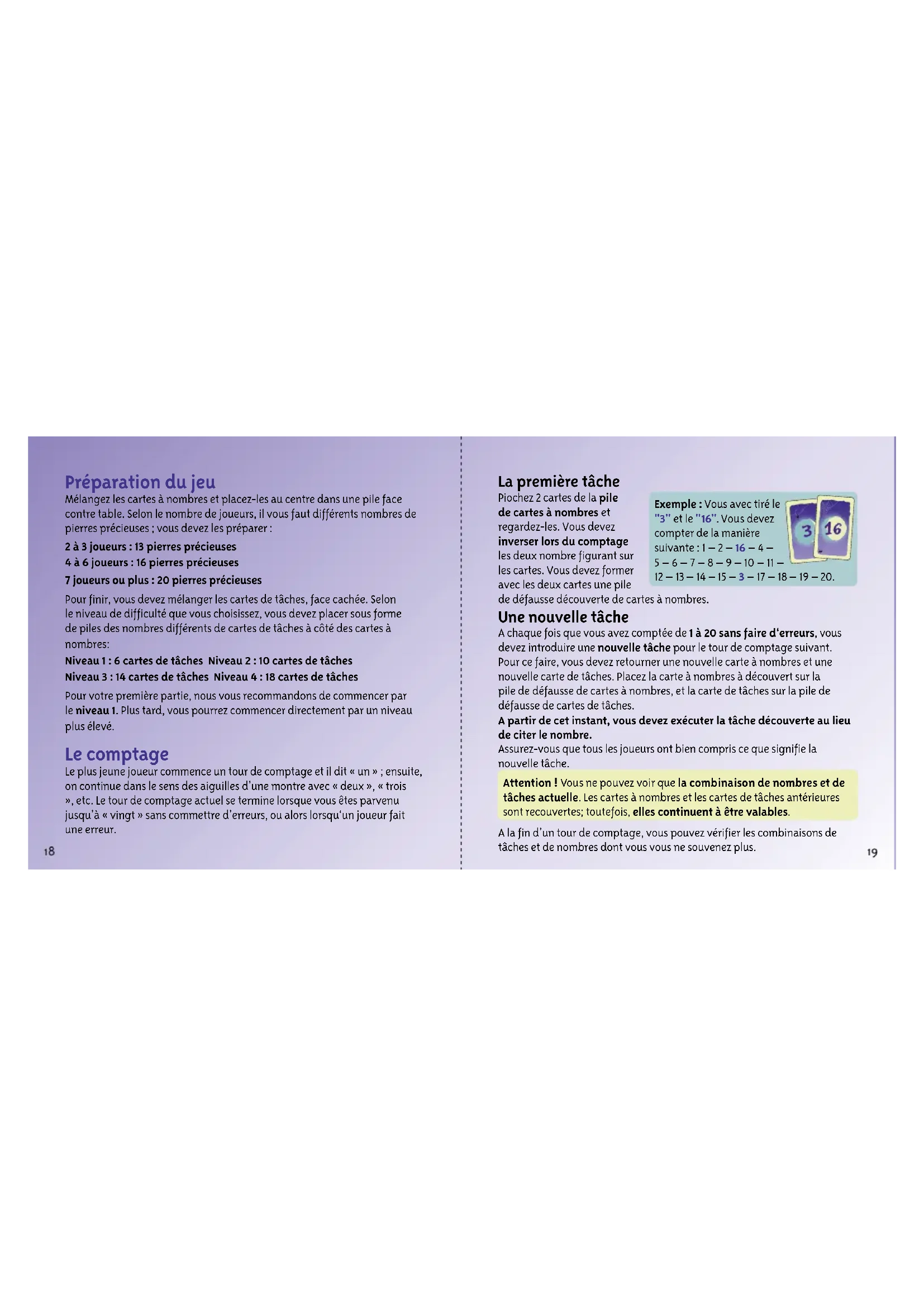 Préparation du jeu Mélangez les cartes à nombres et placez-les au centre dans une pile face contre table. Selon le nombre de joueurs, il vous faut différents nombres de pierres précieuses ; vous devez les préparer : 2 à 3 joueurs : 13 pierres précieuses 4 à 6 joueurs : 16 pierres précieuses 7 joueurs ou plus : 20 pierres précieuses Pour finir, vous devez mélanger les cartes de tâches, face cachée. Selon le niveau de difficulté que vous choisissez, vous devez placer sous forme de piles des nombres différents de cartes de tâches à côté des cartes à nombres: Niveau 1 : 6 cartes de tâches Niveau 2 : 10 cartes de tâches Niveau 3 : 14 cartes de tâches Niveau 4 : 18 cartes de tâches Pour votre première partie, nous vous recommandons de commencer par le niveau 1. Plus tard, vous pourrez commencer directement par un niveau plus élevé. Le comptage Le plus jeune joueur commence un tour de comptage et il dit « un » ; ensuite, on continue dans le sens des aiguilles d’une montre avec « deux », « trois », etc. Le tour de comptage actuel se termine lorsque vous êtes parvenu jusqu’à « vingt » sans commettre d’erreurs, ou alors lorsqu‘un joueur fait une erreur. La première tâche Piochez 2 cartes de la pile de cartes à nombres et regardez-les. Vous devez inverser lors du comptage les deux nombre figurant sur les cartes. Vous devez former avec les deux cartes une pile de défausse découverte de cartes à nombres. Une nouvelle tâche A chaque fois que vous avez comptée de 1 à 20 sans faire d‘erreurs, vous devez introduire une nouvelle tâche pour le tour de comptage suivant. Pour ce faire, vous devez retourner une nouvelle carte à nombres et une nouvelle carte de tâches. Placez la carte à nombres à découvert sur la pile de défausse de cartes à nombres, et la carte de tâches sur la pile de défausse de cartes de tâches. A partir de cet instant, vous devez exécuter la tâche découverte au lieu de citer le nombre. Assurez-vous que tous les joueurs ont bien compris ce que signifie la nouvelle tâche. Attention ! Vous ne pouvez voir que la combinaison de nombres et de tâches actuelle. Les cartes à nombres et les cartes de tâches antérieures sont recouvertes; toutefois, elles continuent à être valables. A la fin d’un tour de comptage, vous pouvez vérifier les combinaisons de tâches et de nombres dont vous vous ne souvenez plus. Exemple : Vous avec tiré le "3" et le "16". Vous devez compter de la manière suivante : 1 – 2 – 16 – 4 – 5 – 6 – 7 – 8 – 9 – 10 – 11 – 12 – 13 – 14 – 15 – 3 – 17 – 18 – 19 – 20. Biss20_Karten_RS_final_4.indd 3Biss20_Karten_RS_final_4.indd 3 04.08.20 14:2604.08.20 14:26 Biss20_Karten_RS_final_4.indd 16Biss20_Karten_RS_final_4.indd 16 04.08.20 14:2604.08.20 14:2620