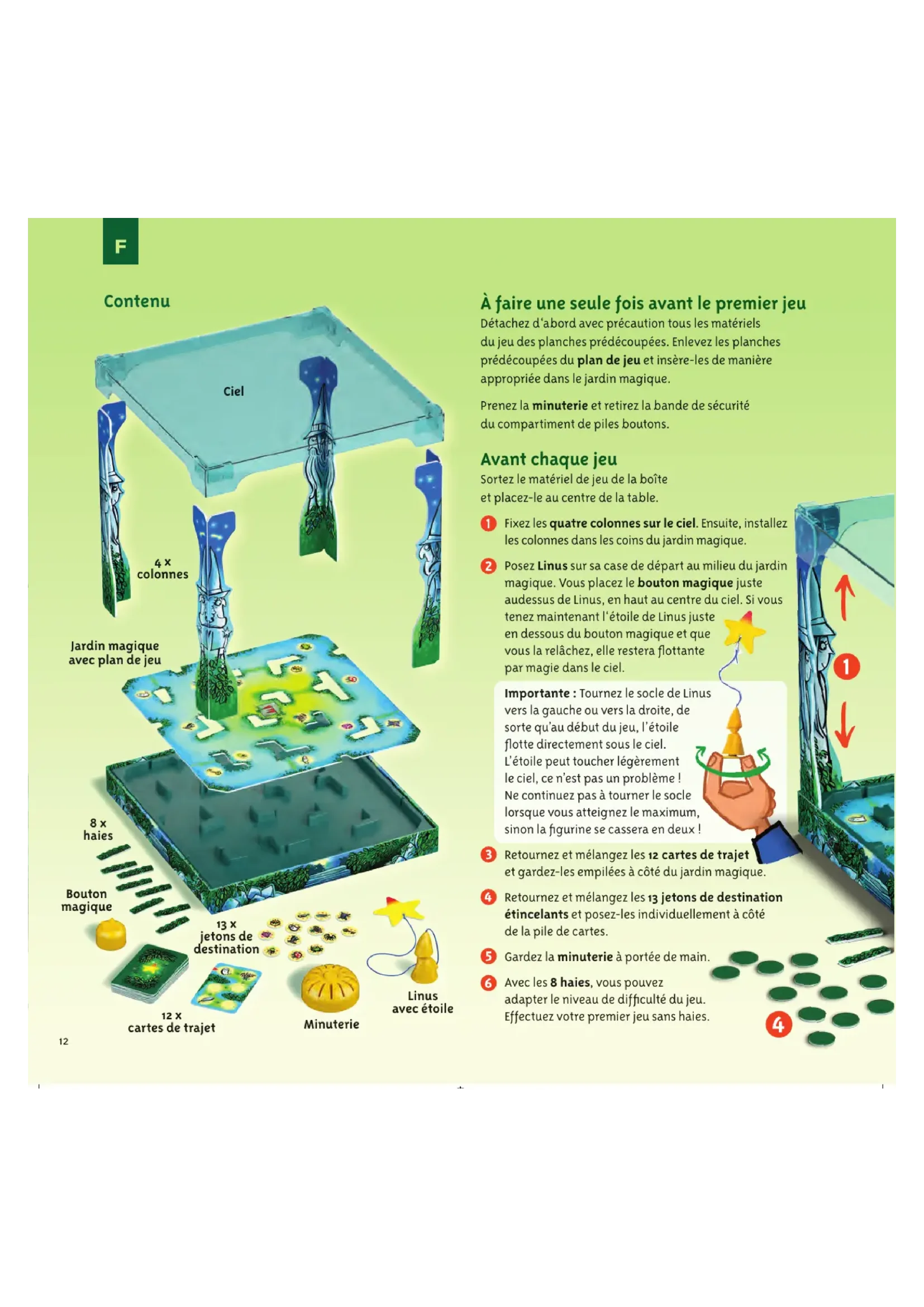 Irrgarten_Anleitung_final_13.indd 11Irrgarten_Anleitung_final_13.indd 11 06.11.23 12:0106.11.23 12:01Contenu Jardin magique avec plan de jeu 4 x colonnes Linus avec étoile Bouton magique Minuterie 12 x cartes de trajet 13 x jetons de destination 8 x haies À faire une seule fois avant le premier jeu Détachez d‘abord avec précaution tous les matériels du jeu des planches prédécoupées. Enlevez les planches prédécoupées du plan de jeu et insère-les de manière appropriée dans le jardin magique. Prenez la minuterie et retirez la bande de sécurité du compartiment de piles boutons. Avant chaque jeu Sortez le matériel de jeu de la boîte et placez-le au centre de la table. Fixez les quatre colonnes sur le ciel. Ensuite, installez les colonnes dans les coins du jardin magique. Posez Linus sur sa case de départ au milieu du jardin magique. Vous placez le bouton magique juste audessus de Linus, en haut au centre du ciel. Si vous tenez maintenant l‘étoile de Linus juste en dessous du bouton magique et que vous la relâchez, elle restera flottante par magie dans le ciel. Importante : Tournez le socle de Linus vers la gauche ou vers la droite, de sorte qu’au début du jeu, l’étoile flotte directement sous le ciel. L’étoile peut toucher légèrement le ciel, ce n’est pas un problème! Ne continuez pas à tourner le socle lorsque vous atteignez le maximum, sinon la figurine se cassera en deux ! Retournez et mélangez les 12 cartes de trajet et gardez-les empilées à côté du jardin magique. Retournez et mélangez les 13 jetons de destination étincelants et posez-les individuellement à côté de la pile de cartes. Gardez la minuterie à portée de main. Avec les 8 haies, vous pouvez adapter le niveau de difficulté du jeu. Effectuez votre premier jeu sans haies. Ciel