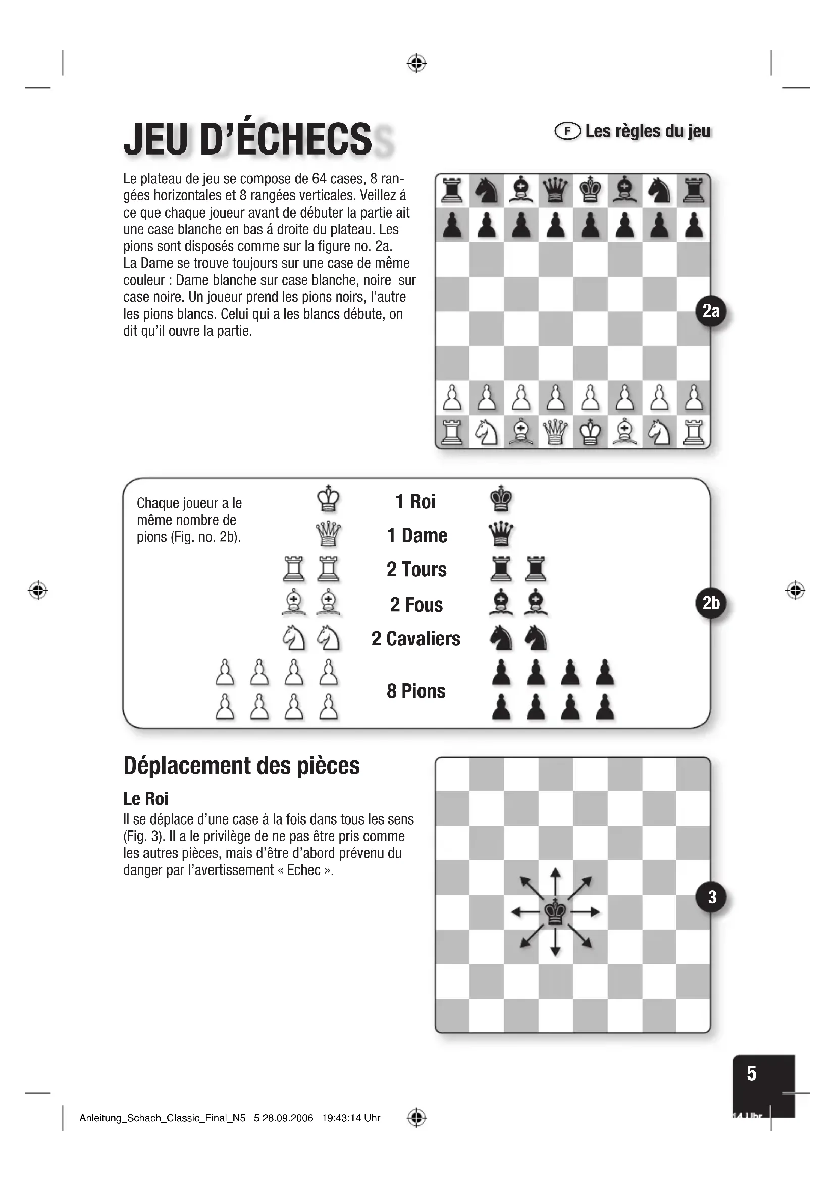 man seine eigenen Figuren möglichst mehrfach durch andere deckt bzw. schützt. 10a 10b Anleitung_Schach_Classic_Final_N4 4 28.09.2006 19:43:12 Uhr5 Le plateau de jeu se compose de 64 cases, 8 ran-gées horizontales et 8 rangées verticales. Veillez á ce que chaque joueur avant de débuter la partie ait une case blanche en bas á droite du plateau. Les pions sont disposés comme sur la figure no. 2a. La Dame se trouve toujours sur une case de même couleur : Dame blanche sur case blanche, noire sur case noire. Un joueur prend les pions noirs, l’autre les pions blancs. Celui qui a les blancs débute, on dit qu’il ouvre la partie.