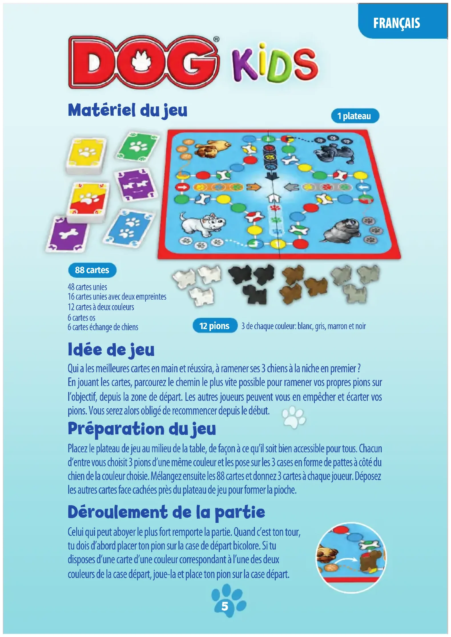 Anleitung_DOG-KIDS_KG58_DIN_A5_FINAL_29.11.2019.pdf 4 29/11/2019 12:04:24Idée de jeu Qui a les meilleures cartes en main et réussira, à ramener ses 3chiens à la niche en premier? En jouant les cartes, parcourez le chemin le plus vite possible pour ramener vos propres pions sur l’objectif, depuis la zone de départ. Les autres joueurs peuvent vous en empêcher et écarter vos pions. Vous serez alors obligé de recommencer depuis le début. Préparation du jeu Placez le plateau de jeu au milieu de la table, de façon à ce qu’il soit bien accessible pour tous. Chacun d’entre vous choisit 3 pions d’une même couleur et les pose sur les 3 cases en forme de pattes à côté du chien de la couleur choisie. Mélangez ensuite les 88 cartes et donnez 3 cartes à chaque joueur. Déposez les autres cartes face cachées près du plateau de jeu pour former la pioche. Déroulement de la partie Celui qui peut aboyer le plus fort remporte la partie. Quand c’est ton tour, tu dois d’abord placer ton pion sur la case de départ bicolore. Si tu disposes d’une carte d’une couleur correspondant à l’une des deux couleurs de la case départ, joue-la et place ton pion sur la case départ. FRANÇAIS