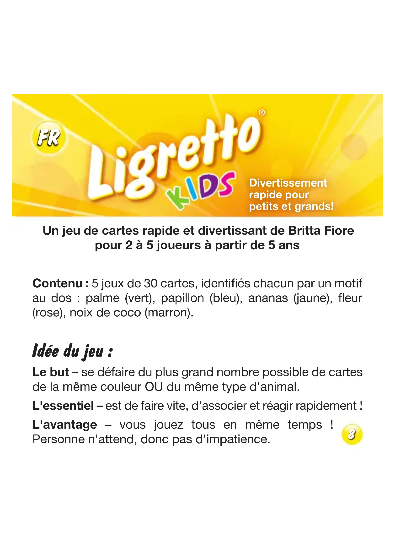 Divertissement rapide pour petits et grands! 8Préparatifs : Triez les cartes en 5 paquets, selon leur dos (palme, papillon, ananas, fleur, noix de coco). Chaque joueur se munit d'une pile de 30 cartes. Vous conservez votre pile de cartes jusqu'à la fin du jeu. Si vous êtes moins de 5 à jouer, les piles de cartes restantes sont sorties du jeu. Mélangez bien les cartes de votre pile. Prenez ensuite votre pile de cartes en main, le dos des cartes étant dirigé vers le haut, et posez la carte du haut de la pile, face visible, au milieu de la table. Les cartes au milieu de la table (2 pour 2 joueurs, 3 pour 3 joueurs, etc.) constituent les cartes de départ de votre pile de jeu. Chaque joueur a le droit de poser des cartes sur chacune de ces piles ! Remarque particulière : en alternative, vous pouvez poser votre donne sur la table et retourner puis poser ainsi vos cartes. 9Déroulement du jeu : L'un de vous donne le signal de départ « Ligretto ! ». Chacun de vous essaie alors, en même temps que les autres, de se défaire d'autant de cartes que possible, en retournant une carte après l'autre et en les posant au milieu de la table, sur la pile qui convient. Règles pour la pose des cartes :