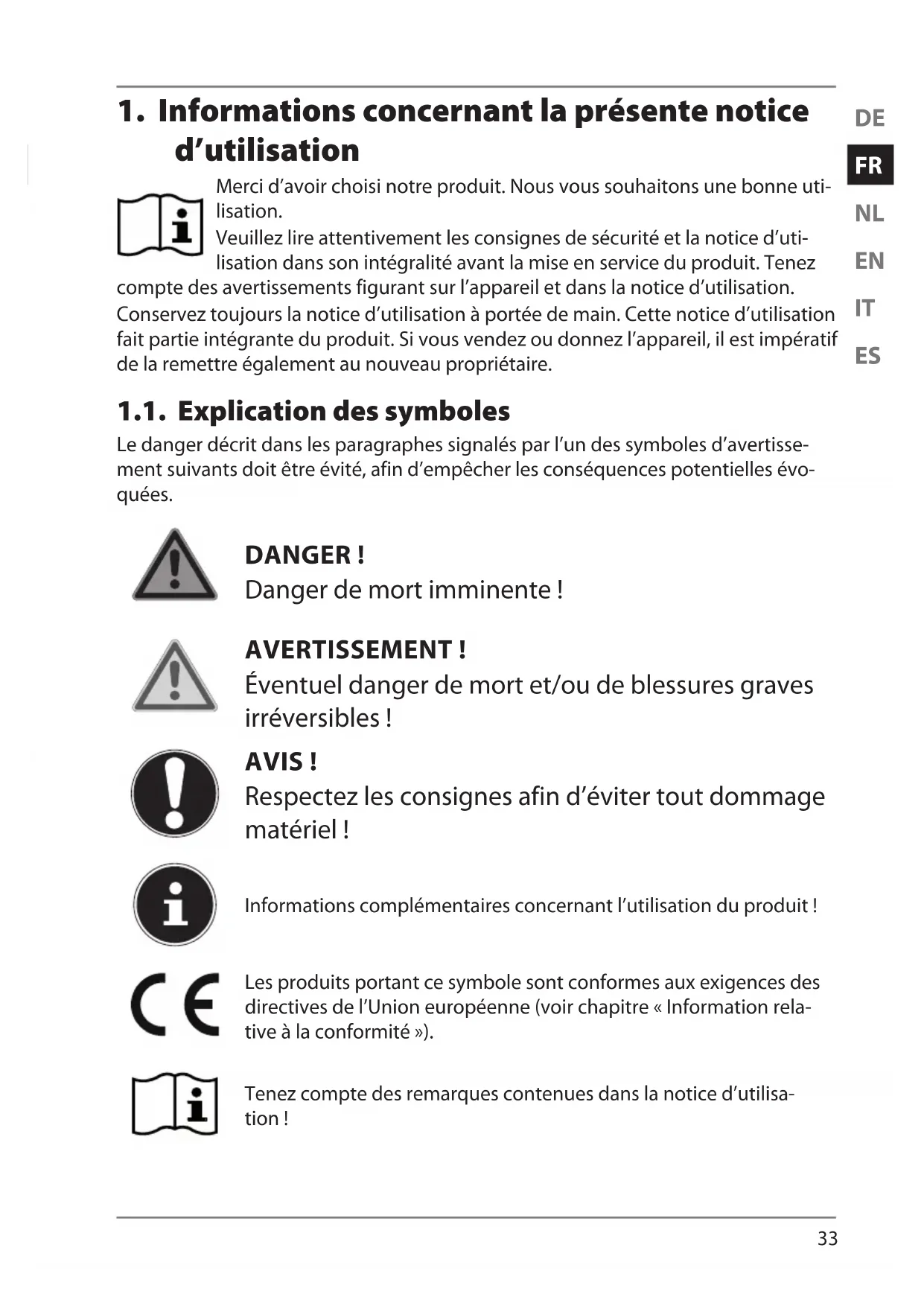 1. Informations concernant la présente notice d’utilisation ...................... 33