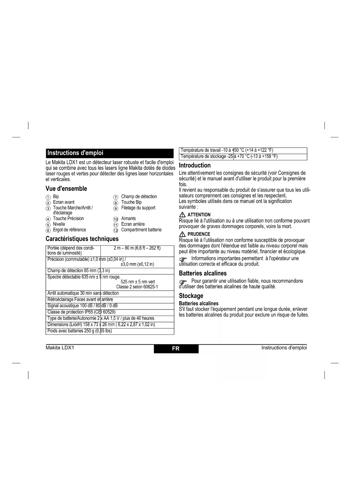 Compartiment batterie Portée (dépend des condi- tions de luminosité) 2 m – 80 m (6,6 ft – 262 ft) Précision (commutable) ±1,0 mm (±0,04 in) / ±3,0 mm (±0,12 in) Champ de détection 85 mm (3,3 in) Spectre détectable 635 nm ± 5 nm rouge, 525 nm ± 5 nm vert Classe 2 selon 60825-1 Arrêt automatique 30 min sans détection Rétroéclairage Faces avant et arrière Signal acoustique 100 dB / 80 dB / 0 dB Classe de protection IP65 (CEI 60529) Type de batterie/Autonomie 2 x AA 1,5 V / plus de 40 heures Dimensions (LxlxH) 158 x 73 x 26 mm ( 6,22 x 2,87 x 1,02 in) Poids avec batteries 250 g (0,55 lbs) Température de travail -10 à +50 °C (+14 à +122 °F) Température de stockage -25 à +70 °C (-13 à +158 °F)FR Makita LDX1