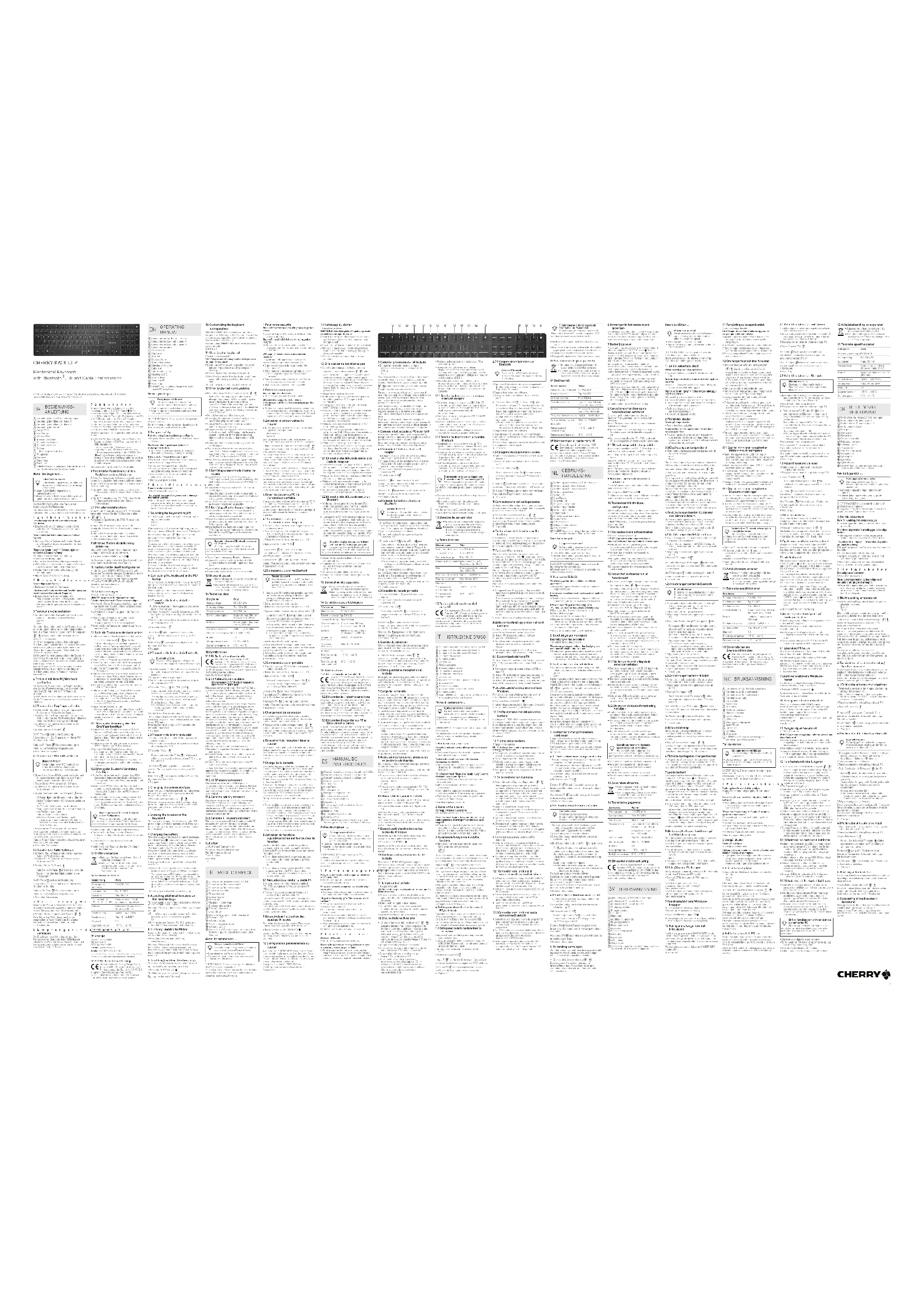 - Ne jetez pas les appareils portant ce symbole avec les ordures ménagères.• Éliminez les appareils conformément aux dispositions légales chez votre revendeur ou dans les points de collecte municipaux. 14 Caractéristiques techniques 15 Certifications 15.1 Déclaration de conformité UELa société Cherry Europe GmbH, Auerbach/OPf., Allemagne, déclare par la présente que ce type d’équipement radioélectrique est conforme à la directive européenne 2014/53/UE. Vous trouverez l’intégralité de la déclaration de conformité UE sur Internet, à l'adresse suivante : www.cherry.de/compliance.15.2 Déclaration de l'industrie canadienneLe present appareil es conforme aux CNR d’ISED applicable aux appareils radio exempts de licence. L’exploitation est autorisée aux deux conditions suivantes : (1) le dispositif ne doit pas produire préjudiciable, et (2) ce dispositif doit accepter tout brouillage reçu, y compris un brouillage susceptible de provoquer un fonctionnement indésirable. 15.3 Déclaration d'exposition aux RF au Etats-Unis et le CanadaLe produit est conforme aux limites d’exposition pour les appareils portables RF pour Etats-Unis et le Canada établis pour un environnement non contrôlé. Le produit est sûr pour un fonctionnement tel que décrit dans ce manuel. La réduction aux expositions RF peut être augmentée si l’appareil peut être conservé aussi loin que possible du corps de l’utilisateur ou que le dispositif est réglé sur la puissance de sortie la plus faible si une telle fonction est disponible.① Conexión a través de receptor de radio de 2,4 GHz② Conexión a través del canal 1 de Bluetooth③ Conexión a través del canal 2 de Bluetooth④ Conexión por cable⑤ Título anterio⑥ Inicio/Pausa⑦ Título siguiente⑧ Navegador, página de inicio⑨ Iluminación más oscura⑩ Iluminación más brillante⑪ Calculadora⑫ Iniciar programa de correo electrónico⑬ Bloqueo del PC⑭ Bajar volumen⑮ Activar/desactivar el sonido⑯ Subir volumen⑰ Tecla CHERRY para el estado de carga de la batería y para desactivar las teclas de Windows Antes de empezar ... CHERRY KW X ULP es un teclado para PC y ordenador portátil.En la dirección www.cherry.de podrá, entre otros, encontrar y descargar información sobre los productos. 1Para su seguridad Peligro de asfixia debido al atragantamiento con piezas pequeñas• Mantenga el aparato fuera del alcance de los niños menores de 3 años.Peligro de incendio provocado por la batería fija recargable• No rompa el teclado, por ejemplo, desarmándolo, aplastándolo, calentándolo o quemándolo."Repetitive Strain Injury" = "Síndrome del túnel carpiano"El RSI se origina por movimientos pequeños, repetidos continuamente.• Organice su puesto de trabajo de forma ergonómica.• Para trabajar con comodidad, seleccione una inclinación del teclado con las patas situadas en la parte inferior.• Haga varias pausas cortas, cuando sea necesario con ejercicios de estiramiento.• Cambie con frecuencia la postura corporal. 2Evitar daños Daños en el teclado• No retire las caperuzas de las teclas.Borrado de soportes de datos y daños en relojes mecánicos provocados por el imán• No sitúe soportes de memoria (como tarjetas magnéticas o discos duros externos) ni relojes mecánicos a menos de 10 cm del receptáculo del receptor situado en la parte trasera del teclado.Utilisation de plusieurs appareils Blue-tooth sur un PC / ordinateur portableLorsque trop d’appareils Bluetooth sont connectés, les récepteurs Bluetooth intégrés au PC / à l’ordinateur portables peuvent être saturés.Désignation ValeurAlimentation 5,0 V/CC ±5 %Tension de charge Typ. 5,0 V/CC Courant de charge Max. 500 mA Consommation de courant Clavier : max. 500 mA Récepteur : max. 20 mA Batterie Batterie aux ions Lithium rechargeable, 2800 mAhFréquence d’émission2400,0 ... 2483,5 MHzPuissance d’émissionMax. 10 mW (PIRE)Bluetooth 5.0Température de stockage-15 °C ... +60 °CTempérature de fonctionnement0 °C ... +40 °C
