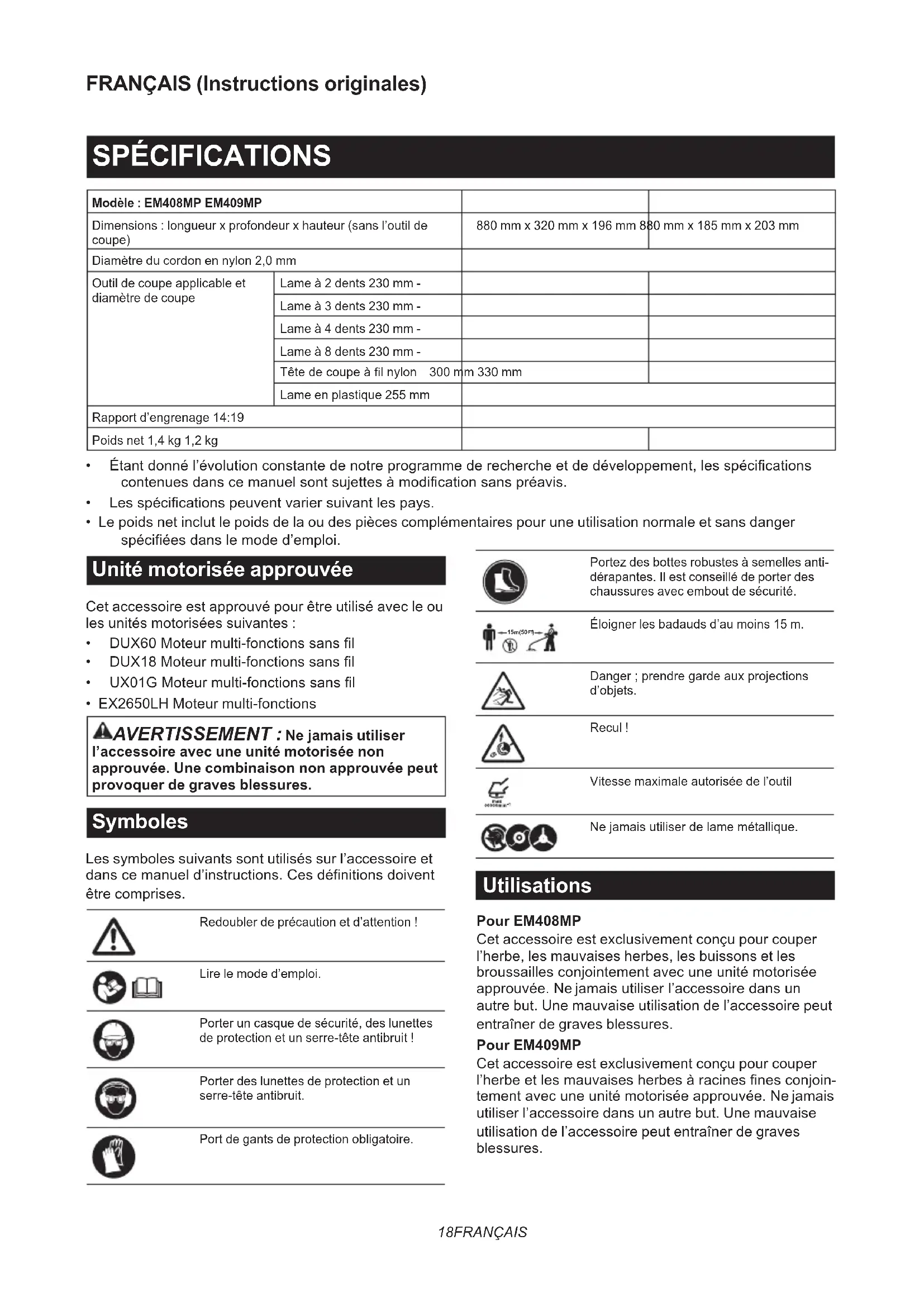 Éloigner les badauds d’au moins 15 m. Danger;prendregardeauxprojections d’objets. Recul ! Vitesse maximale autorisée de l’outil Nejamaisutiliserdelamemétallique. Utilisations Pour EM408MP Cet accessoire est exclusivement conçu pour couper l’herbe, les mauvaises herbes, les buissons et les broussaillesconjointementavecuneunitémotorisée approuvée.Nejamaisutiliserl’accessoiredansun autre but. Une mauvaise utilisation de l’accessoire peut entraîner de graves blessures. Pour EM409MP Cet accessoire est exclusivement conçu pour couper l’herbeetlesmauvaisesherbesàracinesnesconjoin- tementavecuneunitémotoriséeapprouvée.Nejamais utiliser l’accessoire dans un autre but. Une mauvaise utilisation de l’accessoire peut entraîner de graves blessures.19 FRANÇAIS