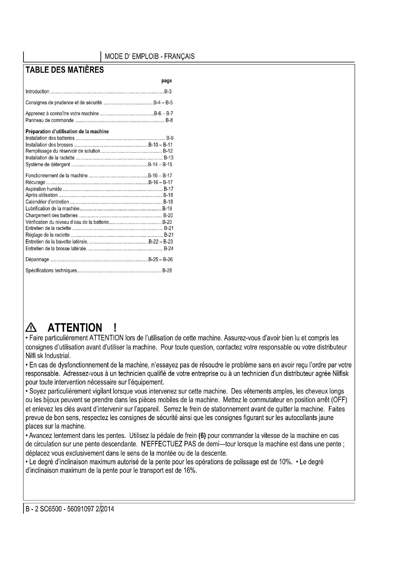 Ce mode d’emploi vous permettra d’exploiter au maximum les fonctionnalités de votre nettoyeuse autoportée Nilfi sk. Lisez-le donc attentivement avant d’utiliser votre machine. Remarque : Les chiffres en gras entre parenthèses indiquent que la pièce fi gure sur les dessins des pages B-6 – B-8 du présent manuel. Ce produit est uniquement destiné à un usage commercial.