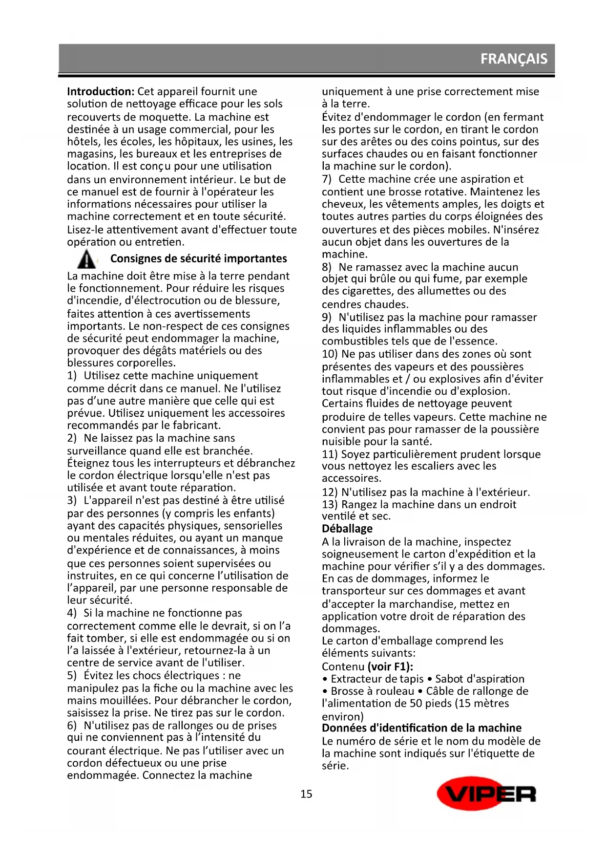Introduction: Cet appareil fournit une solution de nettoyage efficace pour les sols recouverts de moquette. La machine est destinée à un usage commercial, pour les hôtels, les écoles, les hôpitaux, les usines, les magasins, les bureaux et les entreprises de location. Il est conçu pour une utilisation dans un environnement intérieur. Le but de ce manuel est de fournir à l'opérateur les informations nécessaires pour utiliser la machine correctement et en toute sécurité. Lisez-le attentivement avant d'effectuer toute opération ou entretien.