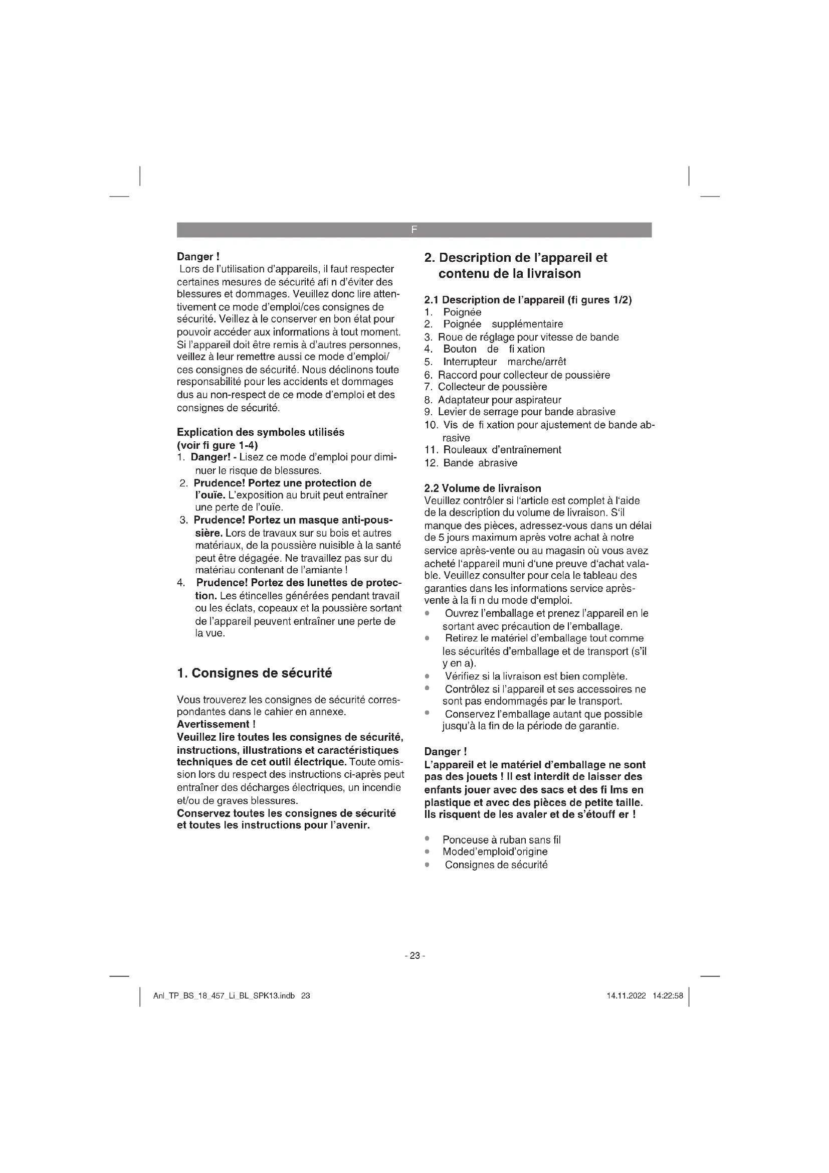 (fi g. 8 / pos. 3) En tournant la roue de réglage (3), vous pouvez présélectionner la vitesse de bande. Anl_TP_BS_18_457_Li_BL_SPK13.indb 25Anl_TP_BS_18_457_Li_BL_SPK13.indb 25 14.11.2022 14:22:5914.11.2022 14:22:59F