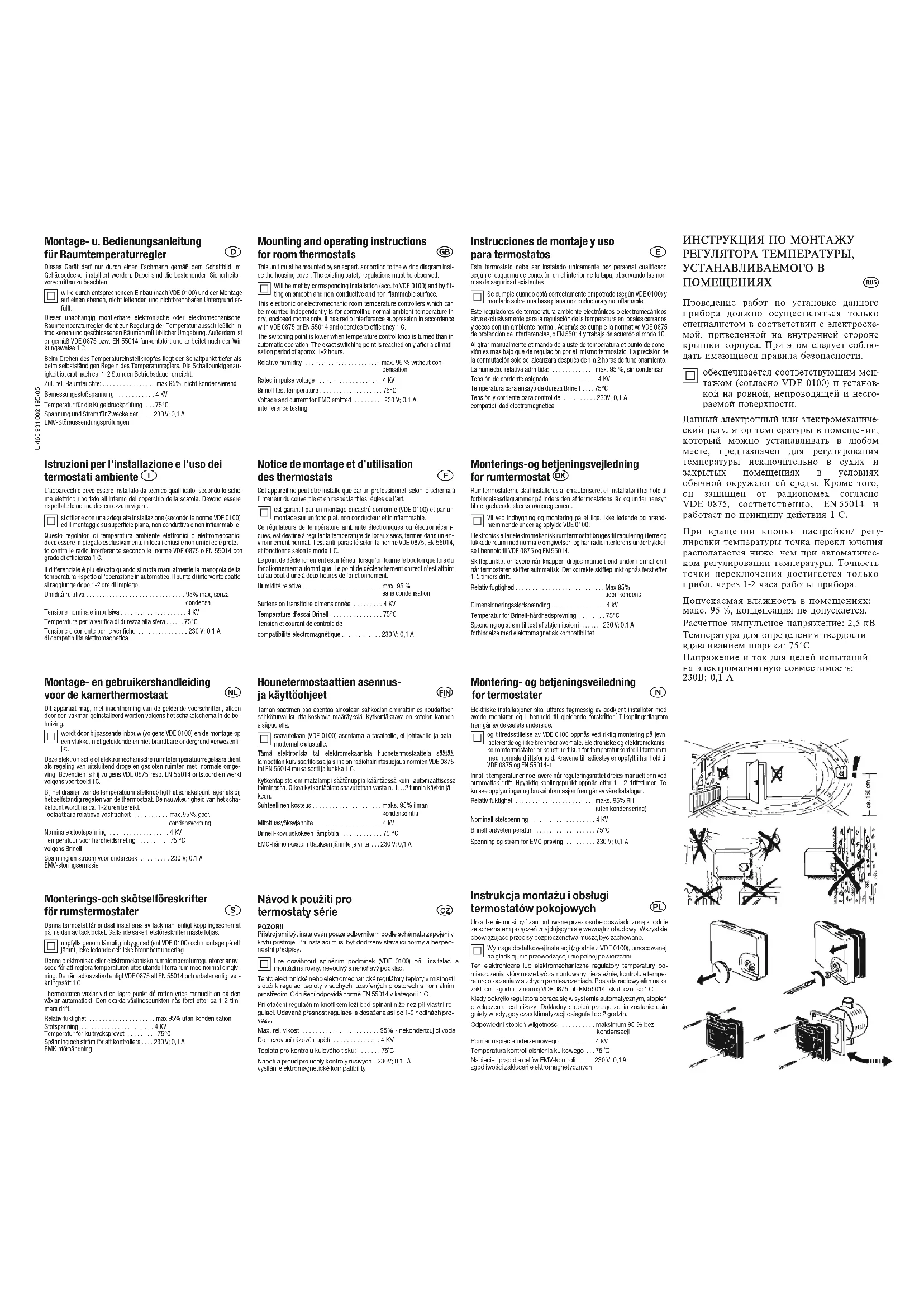 This unit must be mounted by an expert, according to the wiring diagram insi-de the housing cover. The existing safety regulations must be observed. Will be met by corresponding installation (acc. to VDE 0100) and by fit-ting on smooth and non-conductive and non-flammable surface.This electronic or electromechanic room temperature controllers which canbe mounted independently is for controlling normal ambient temperature indry, enclosed rooms only. It has radio interference suppression in accordancewith VDE 0875 or EN 55014 and operates to efficiency 1 C.The switching point is lower when temperature control knob is turned than inautomatic operation. The exact switching point is reached only after a climati-sation period of approx. 1-2 hours.Relative humidity . . . . . . . . . . . . . . . . . . . . . . . max. 95 % without con-densationRated impulse voltage . . . . . . . . . . . . . . . . . . . . 4 KVBrinell test temperature . . . . . . . . . . . . . . . . . . . 75°CVoltage and current for EMC emitted . . . . . . . . . 230 V; 0.1 Ainterference testing Notice de montage et d’utilisation des thermostats Cet appareil ne peut être installé que par un professionnel selon le schéma àl’interiéur du couvercle et en respectant les règles de l’art. est garantit par un montage encastré conforme (VDE 0100) et par unmontage sur un fond plat, non conducteur et ininflammable.Ce régulateurs de température ambiante électroniques ou électromécani-ques, est destiné à réguler la température de locaux secs, fermés dans un en-vironnement normal. Il est anti-parasité selon la norme VDE 0875, EN 55014,et fonctionne selon le mode 1 C.Le point de déclenchement est inférieur lorsqu’on tourne le bouton que lors dufonctionnement automatique. Le point de déclenchement correct n’est attointqu’au bout d’une à deux heures de fonctionnement.Humidité relative . . . . . . . . . . . . . . . . . . . . . . . . max. 95 %sans condensationSurtension transitoire dimensionnée . . . . . . . . . 4 KVTempérature d’essai Brinell . . . . . . . . . . . . . . . 75°CTension et courant de contrôle decompatibilité électromagnétique . . . . . . . . . . . . 230 V; 0,1 A Monterings-och skötselföreskrifter för rumstermostater