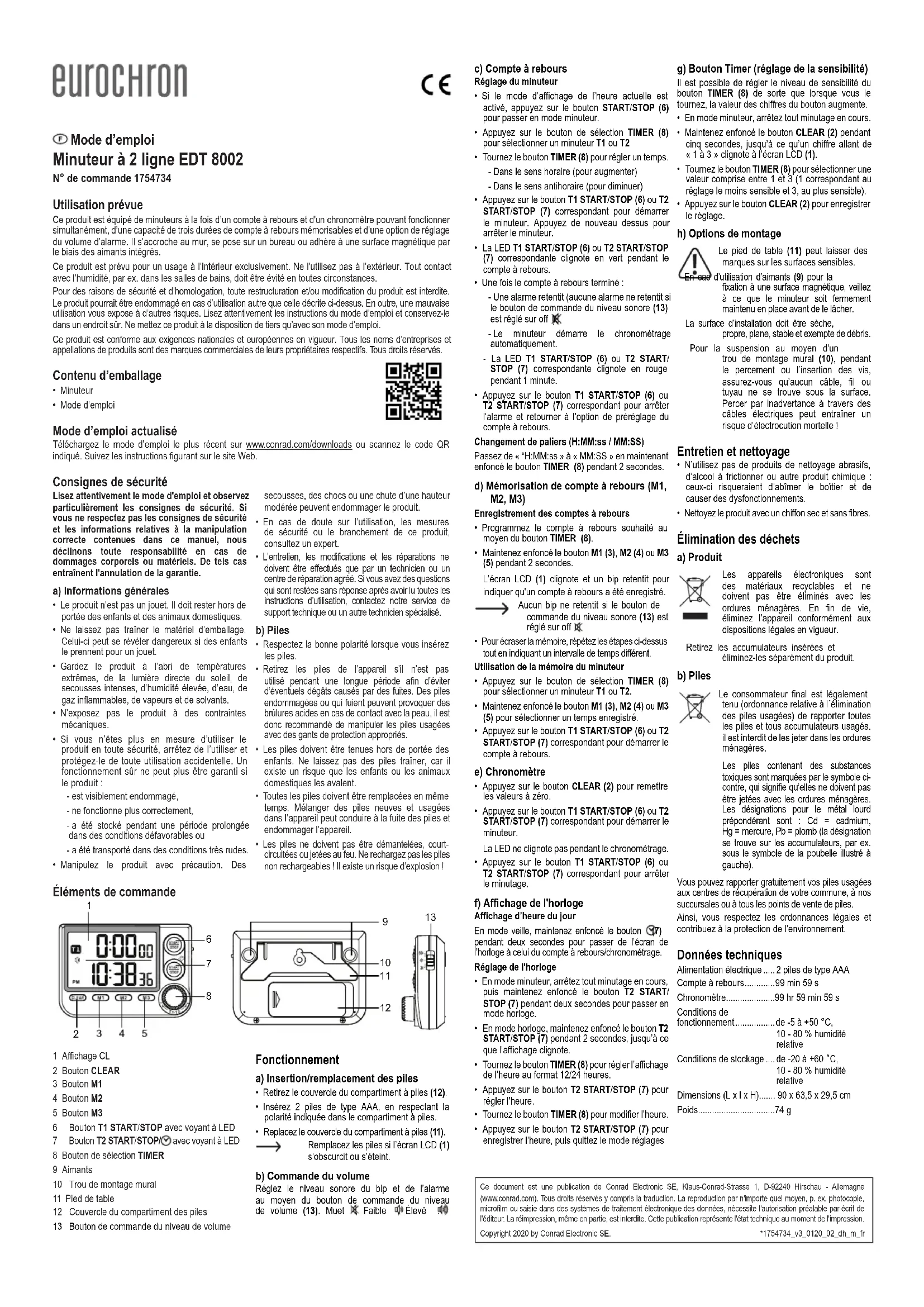 Mode d’emploi Minuteur à 2 ligne EDT 8002 N° de commande 1754734 Utilisation prévue Ce produit est équipé de minuteurs à la fois d’un compte à rebours et d'un chronomètre pouvant fonctionner simultanément, d’une capacité de trois durées de compte à rebours mémorisables et d’une option de réglage du volume d’alarme. Il s’accroche au mur, se pose sur un bureau ou adhère à une surface magnétique par le biais des aimants intégrés.Ce produit est prévu pour un usage à l’intérieur exclusivement. Ne l'utilisez pas à l’extérieur. Tout contact avec l’humidité, par ex. dans les salles de bains, doit être évité en toutes circonstances.Pour des raisons de sécurité et d’homologation, toute restructuration et/ou modification du produit est interdite. Le produit pourrait être endommagé en cas d’utilisation autre que celle décrite ci-dessus. En outre, une mauvaise utilisation vous expose à d’autres risques. Lisez attentivement les instructions du mode d’emploi et conservez-le dans un endroit sûr. Ne mettez ce produit à la disposition de tiers qu’avec son mode d’emploi.Ce produit est conforme aux exigences nationales et européennes en vigueur. Tous les noms d’entreprises et appellations de produits sont des marques commerciales de leurs propriétaires respectifs. Tous droits réservés. Contenu d’emballage