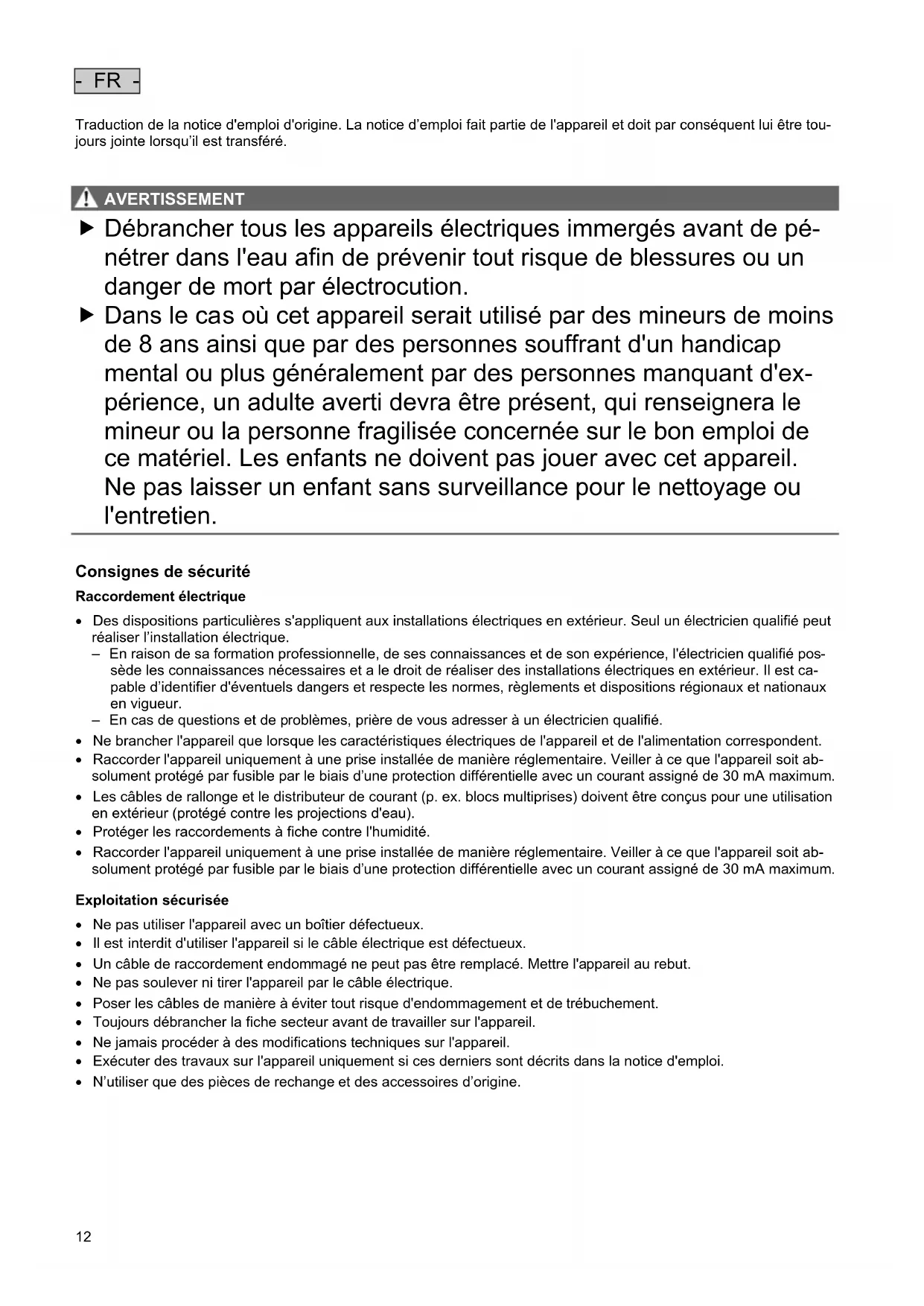 AVERTISSEMENT AVERTISSEMENT Débrancher tous les appareils électriques immergés avant de pé- nétrer dans l'eau afin de prévenir tout risque de blessures ou un danger de mort par électrocution. Dans le cas où cet appareil serait utilisé par des mineurs de moins de 8 ans ainsi que par des personnes souffrant d'un handicap mental ou plus généralement par des personnes manquant d'ex- périence, un adulte averti devra être présent, qui renseignera le mineur ou la personne fragilisée concernée sur le bon emploi de ce matériel. Les enfants ne doivent pas jouer avec cet appareil. Ne pas laisser un enfant sans surveillance pour le nettoyage ou l'entretien.