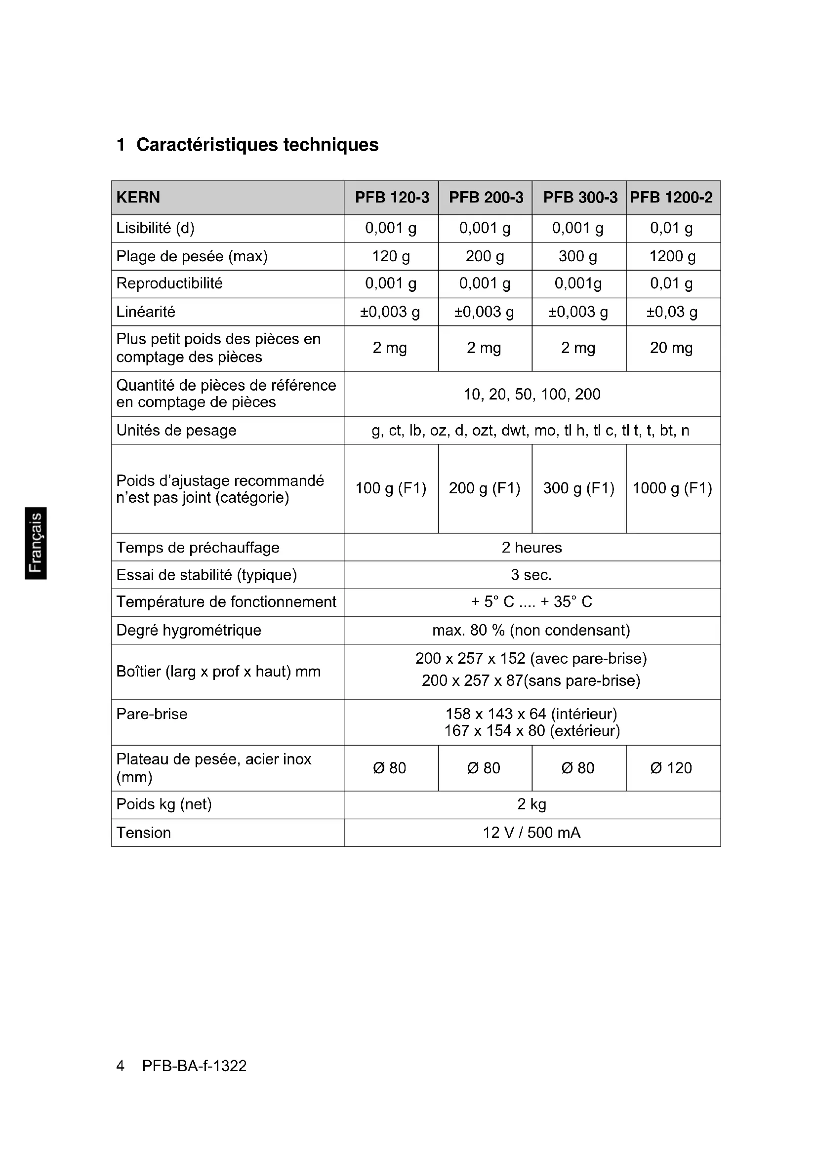 g, ct, Poids d’ajustage recommandé n’est pas joint (catégorie) 600 g (F1) 600 g (F1) Temps de préchauffage 30 minutes 2 heures Essai de stabilité (typique) 3 sec. Température de fonctionnement + 5° C .... + 35° C Degré hygrométrique max. 80 % (non condensant) Boîtier (larg x prof x haut) mm 190 x 220 x 140 (avec pare-brise) 190 x 220 x 60 (sans pare-brise) Pare-brise 158 x 143 x 64 (intérieur) 167 x 154 x 80 (extérieur) Plateau de pesée, acier inox (mm) Ø 120 Poids kg (net) 2 kg Tension 12 V / 500 mAPFB-BA-f-1322 7 KERN