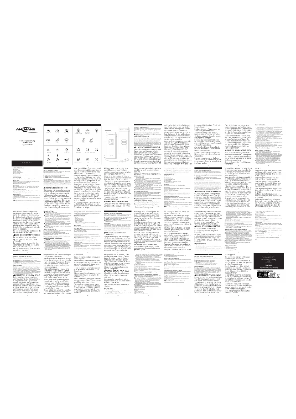 Le produit contient un bloc d’accu non remplaçable, en cas d’accu vide celui-ci doit être rechargé immédiatement.Une fois le chargement complet, arrêter le chargement.En cas de fuite de la source d’énergie, éliminer le liquide avec des gants de protection et un chiffon sec.Recharger la lampe sur un support réfractaire et uniquement sous la surveillance permanente d’un adulte !