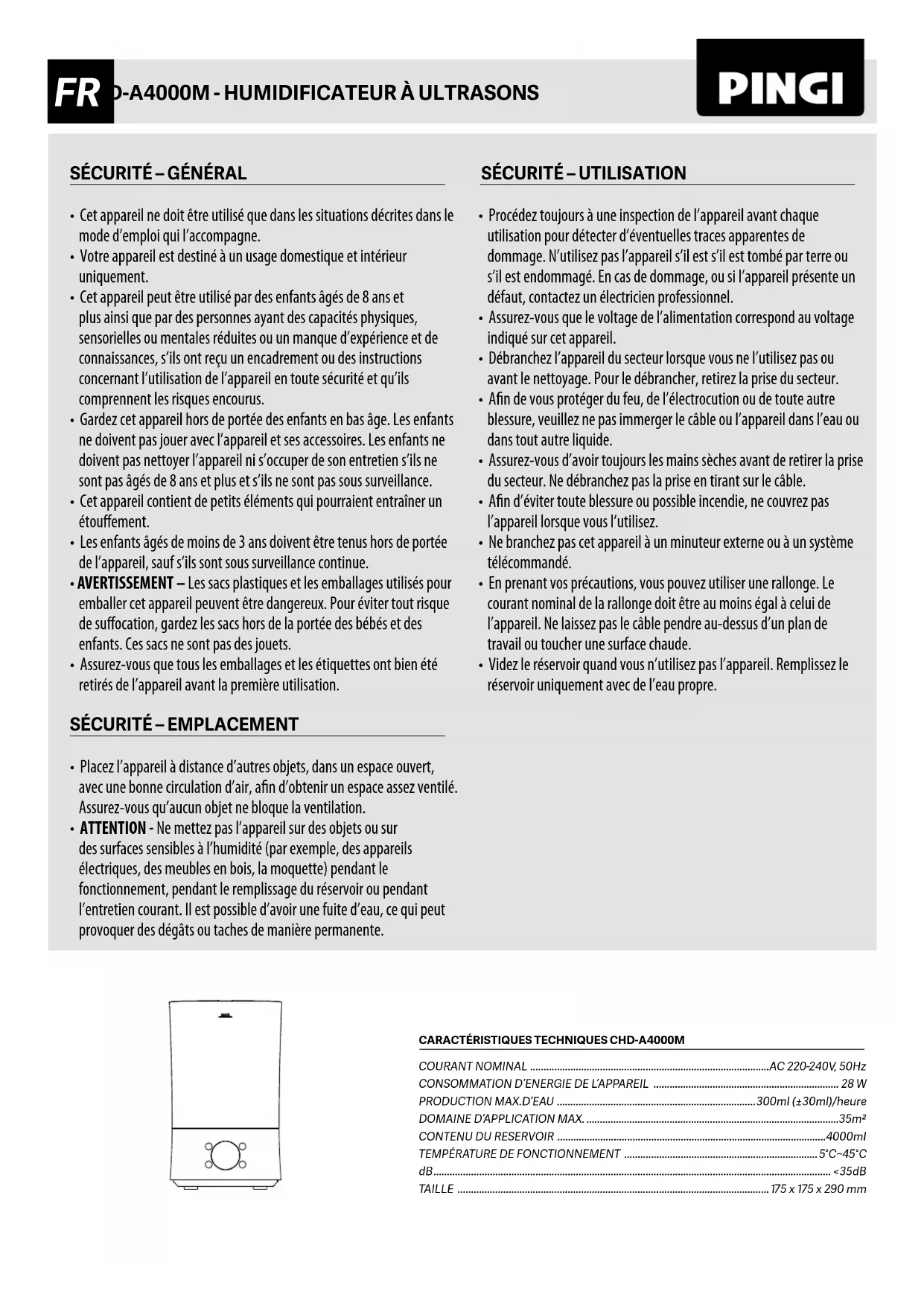 dB .................................................................................................................................................... <35dB TAILLE ....................................................................................................................175 x 175 x 290 mmCONDITIONS D’UTILISATION Votre nouvel humidificateur Pingi Cascada CHD-A4000M est idéal pour humidifier l’air dans les espaces intérieurs clos. L’appareil fonctionne sur du 220-240 V, 50 Hz (secteur). Vous ne devez jamais essayer de relier l’appareil à d’autres sources d’énergie. Veuillez toujours respecter les consignes de sécurité qui sont incluses dans ce mode d’emploi. Conservez ce mode d’emploi dans un endroit sûr, afin de pouvoir le consulter quand vous le souhaitez. Ce produit respecte les exigences règlementaires nationales et européennes. Vous ne devez jamais essayer d’effectuer des modifications techniques sur cet appareil. Nous ne pourrons pas être tenus pour responsables des accidents ou des dégâts occasionnés par le non-respect des consignes de sécurité et du mode d’emploi. FONCTIONNEMENT L’humidificateur Pingi Cascada CHD-A4000M est un humidificateur automatique à ultrasons qui atomise l’eau. Des vibrations de haute fréquence transforment jusqu’à 300 ml (±30 ml) d’eau par heure en légère brume. Il augmentera ainsi le niveau d’humidité de l’air en produisant des milliers de petites gouttelettes. Cet appareil dispose d’un réservoir de 4L. La vitesse d’humidification du CHD-A4000M peut être réglée à l’aide de la molette de commande. Les humidificateurs requièrent un nettoyage régulier pour prévenir l’accumulation de calcaire ou la formation de biofilm. Veuillez consulter la rubrique nettoyage pour plus d’informations.