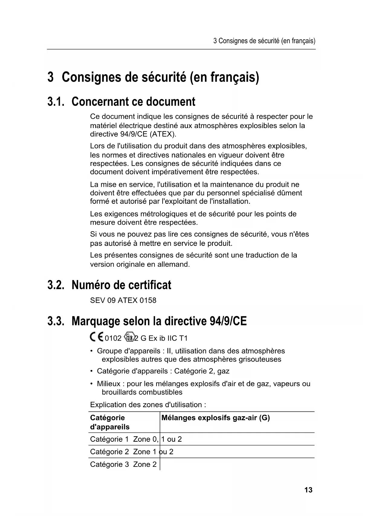 3 Consignes de sécurité (en français) 3.1. Concernant ce document Ce document indique les consignes de sécurité à respecter pour le matériel électrique destiné aux atmosphères explosibles selon la directive 94/9/CE (ATEX). Lors de l'utilisation du produit dans des atmosphères explosibles, les normes et directives nationales en vigueur doivent être respectées. Les consignes de sécurité indiquées dans ce document doivent impérativement être respectées. La mise en service, l'utilisation et la maintenance du produit ne doivent être effectuées que par du personnel spécialisé dûment formé et autorisé par l'exploitant de l'installation. Les exigences métrologiques et de sécurité pour les points de mesure doivent être respectées. Si vous ne pouvez pas lire ces consignes de sécurité, vous n'êtes pas autorisé à mettre en service le produit. Les présentes consignes de sécurité sont une traduction de la version originale en allemand. 3.2. Numéro de certificat SEV 09 ATEX 0158 3.3. Marquage selon la directive 94/9/CE 0102 II 2 G Ex ib IIC T1
