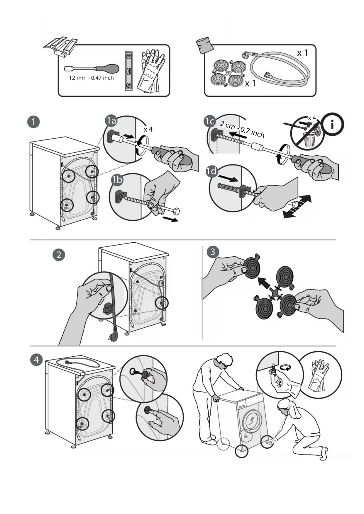 MISE EN GARDE : Cet appareil n’est pas conçu pour être utilisé avec un dispositif de mise en marche externe comme une minuterie ou un système de contrôle à distance. Cet appareil est destiné à un usage domestique et peut aussi être utilisé dans les endroits suivants : cuisines pour le personnel dans les magasins, bureaux et autres environnements de travail; dans les fermes; Par les clients dans les hôtels, motels, chambres d’hôtes, et autres résidences similaires;parties communes des immeubles ou des laveries. Ne chargez pas la machine au-delà de sa capacité maximale (kg de linge sec) indiquée dans le tableau des programmes. Cet appareil n’est pas conçu pour une utilisation professionnelle. N’utilisez pas l’appareil à l’extérieur. N’utilisez pas de solvants (par exemple térébenthine, benzène), de détergents contenant des solvants, de la poudre à récurer, de détergents pour vitre ou tout usage, ou de liquides inammables ; Ne lavez jamais des tissus imbibés avec du solvant ou des liquides inammables dans le lave-linge. INSTALLATION Deux personnes minimum sont nécessaires pour déplacer et installer l’appareil - risque de blessure. Utilisez des gants de protection pour le déballage et l’installation de l’appareil - vous risquez de vous couper. Si vous souhaitez installer un sèche-linge au-dessus de votre lave-linge, vériez d’abord si cela est possible auprès du Service après-vente ou de votre détaillant. Une telle installation nécessite la xation du sèche-linge sur le lave-linge à l’aide d’un kit de superposition adéquat, disponible auprès du Service après-vente ou de votre détaillant. Ne déplacez jamais l’appareil en le tenant par le dessus ou le couvercle. L’installation, incluant l’alimentation en eau (selon le modèle), et les connexions électriques, ainsi que les réparations, doivent être exécutées par un technicien qualié. Ne procédez à aucune réparation ni à aucun remplacement de pièce sur l’appareil autres que ceux spéciquement indiqués dans le guide d’utilisation. Gardez les enfants à l’écart du site d’installation. Après le déballage de l’appareil, assurez-vous qu’il n’a pas été endommagé pendant le transport. En cas de problème, contactez le détaillant ou le Service après- vente le plus proche. Une fois installé, gardez le matériel d’emballage (sacs en plastique, parties en polystyrène, etc.) hors de la portée des enfants - ils pourraient s’étouer. L’appareil ne doit pas être branché à l’alimentation électrique lors de l’installation - vous pourriez vous électrocuter. Au moment de l’installation, assurez-vous que le câble d’alimentation n’est pas endommagé par l’appareil - risque d’incendie ou de choc électrique. Branchez l’appareil seulement après avoir complété l’installation. N’installez pas votre appareil dans un endroit où il pourrait être exposé à des conditions extrêmes comme : mauvaise ventilation, température inférieure à 5°C ou supérieure à 35°C. Lors de l’installation de l’appareil, assurez-vous que les quatre pieds sont stables et reposent sur le sol, en les réglant si nécessaire, et vériez que l’appareil soit parfaitement de niveau en utilisant un niveau à bulle. Si l’appareil est installé sur des planchers en bois ou « ottants » (certains parquets et matériaux stratiés), xez une feuille de contreplaqué de 60 x 60 x 3 cm (au moins) sur le sol, puis placer l’appareil dessus. Raccordez les tuyaux d’alimentation en eau conformément aux réglementation de votre compagnie de distribution d’eau locale. Pour les modèles à remplissage à froid uniquement : Ne raccordez pas l’alimentation d’eau chaude. Pour les modèles avec arrivée d’eau chaude : la température de l’eau chaude à l’arrivée ne doit pas dépasser 60°C.Le lave-linge est doté d’écrous de transport destinés à éviter tout endommagement intérieur pendant le transport. Avant de mettre l’appareil en service, les boulons de transport doivent être impérativement retirés. Une fois cette opération terminée, bouchez les ouvertures à l’aide des 4obturateurs en plastique fournis. Après l’installation du dispositif, attendez quelques heures avant de le démarrer, an de l’acclimater aux conditions environnementales de la pièce. Assurez-vous que les bouches de ventilation à la base de votre lave-linge (selon le modèle) ne sont pas obstruées par de la moquette ou tout autre matériau. Utilisez uniquement de nouveaux tuyaux pour relier l’appareil à l’alimentation d’eau. Les anciens tuyaux ne doivent pas être réutilisés. La pression de l’eau doit être dans la gamme de 0,1-1 MPa. Ne réparez ou remplacez aucune pièce de l’appareil, si ce n’est pas spéciquement indiqué dans le manuel d’utilisation. Faites appel uniquement au Service après-vente agréé. Les réparations que vous eectuez vous-même ou que vous conez à une personne qui n’est pas un professionnel peuvent entraîner des incidents dangereux susceptibles de nuire à la santé des personnes, voire de mettre leur vie en danger, et/ou à des problèmes matériels importants. Les pièces détachées pour la machine à domicile seront disponibles pendant une durée de 10 ans après le lancement de la dernière unité sur le marché, conformément au règlement européen sur l’écoconception. ALIMENTATION ÉLECTRIQUE Il doit être possible de débrancher l’appareil de l’alimentation électrique en retirant la che de la prise de courant si elle est accessible, ou à l’aide d’un interrupteur multipolaire en amont de la prise de courant, conformément aux normes de sécurité électrique nationales. utilisez pas de rallonge, de prises multiples ou d’adaptateurs. Une fois l’installation terminée, l’utilisateur ne doit plus pouvoir accéder aux composantes électriques. N’utilisez pas l’appareil si vous êt