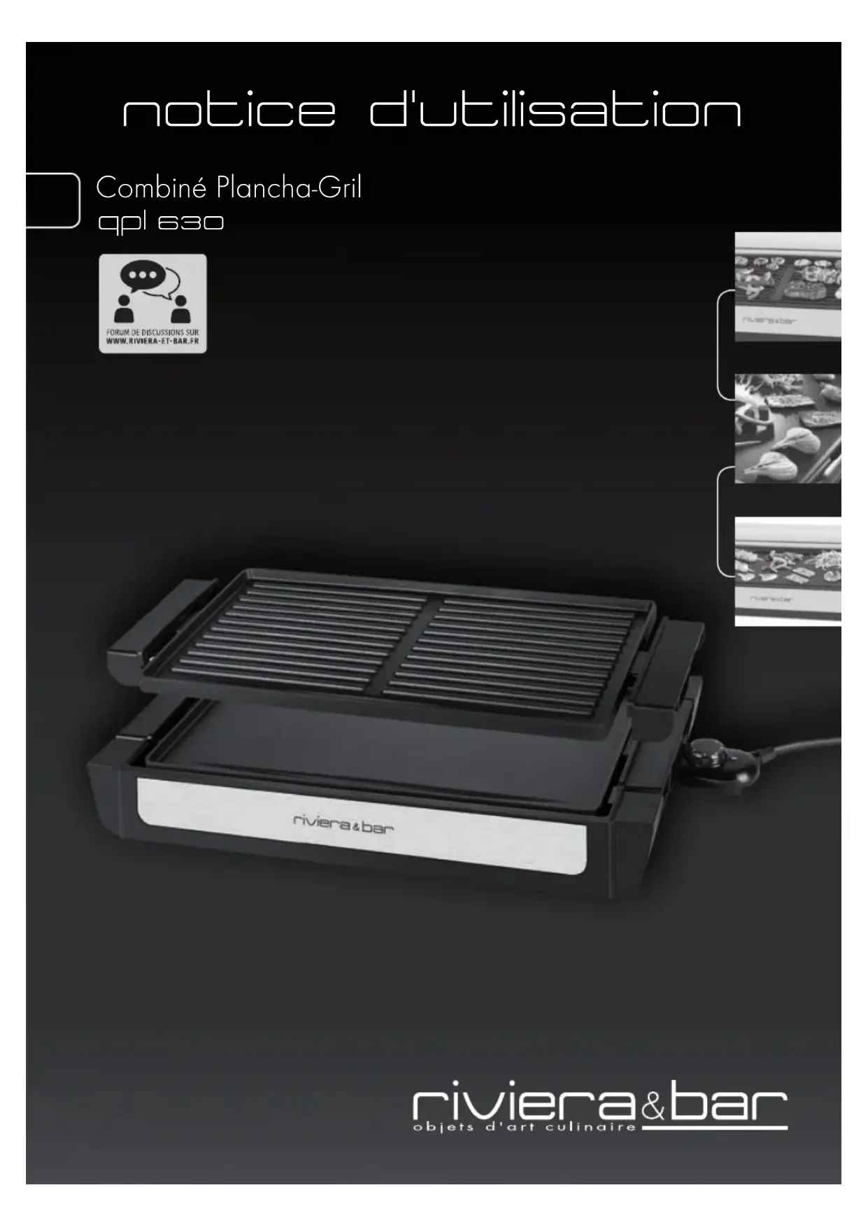 REFERENCE: QPL 630 CODIC: 4225686notice d'utilisation Document et visuels non contractuels - Caractéristiques susceptibles d’être modifiées sans préavis. Mars 2016. V1 Combiné Plancha-Gril qpl 630Avec cet appareil, vous avez fait l’acquisition d’un article de qualité, bénéficiant de toute l’expérience de Riviera & Bar dans le domaine de la cuisson. Il répond aux critères de qualité Riviera & Bar : les meilleurs matériaux et composants ont été utilisés pour sa fabrication, et il a été soumis à des contrôles rigoureux. Nous souhaitons que son usage vous apporte entière satisfaction. Nous vous demandons de lire très attentivement les instructions indiquées dans cette notice, car elles fournissent, entre autres, des informations importantes relatives à la sécurité d’installation, d’utilisation et d’entretien. Gardez votre notice, vous pourriez avoir besoin de vous y référer dans le futur.
