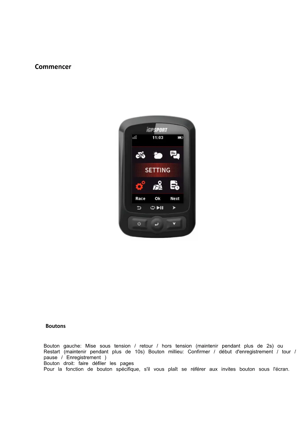 38Commencer Boutons Bouton gauche: Mise sous tension / retour / hors tension (maintenir pendant plus de 2s) ou Restart (maintenir pendant plus de 10s) Bouton millieu: Confirmer / début d'enregistrement / tour / pause / Enregistrement ) Bouton droit: faire défiler les pages Pour la fonction de bouton spécifique, s'il vous plaît se référer aux invites bouton sous l'écran.Installation