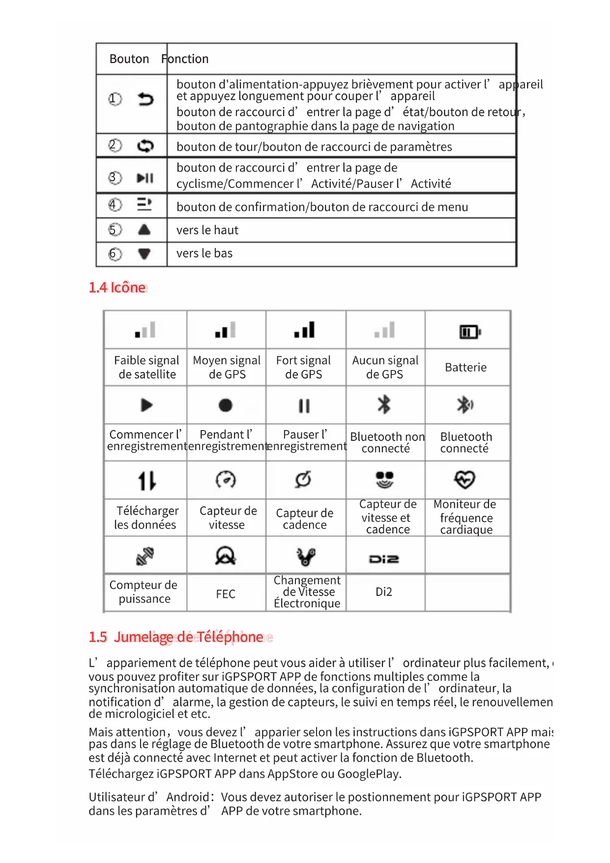 1.1Réglaged'Initialisation 1.1Réglaged'Initialisation1.1Réglaged'Initialisation Appuyezsurleboutonpour2secondes,etactivezl’Appareil. Aprèsl’activationpourlapremièrefois,appuyezsurlebouton,cherchezcedont vousavezbesoin,etpuisappuyezsurleboutonpourconfirmervotreoption.N’ importequellepagevousvoyez,vouspouvezappuyersurleboutonsivousvoulez retourneretmodifier. 1.OptiondeLangues: Appuyezsurleboutonpourchoisirlalangue,appuyezsurleboutonpour sauvegarderlesdonnées,etpuisvisitezl’optionsuivante. 2.JumelagedeTéléphone: TéléchargeziGPSPORTAPPsurvotresmartphone,etappariezl’appareilsur iGPSPORTAPP.Appuyezsurleboutonpourvisiterl’optionsuivante,etappuyez surleboutonpourvisiterl’optionprécédente. 3.Optiondel’UnitédeMesure: Appuyezsurleboutonpourchangerl’unitéenmétrique/impérial.Appuyezsur leboutonpoursauvegarderlesdonnéesetvisiterl’optionsuivante,etappuyez surleboutonpourvisiterl’optionprécédente. 4.OptiondeFuseauxHoraires: Appuyezsurleboutonpourchoisirlapartiedel’heure. Appuyezsurleboutonpoursauvegarderlesdonnéesetpuischoisirlapartiede minute. Appuyezsurleboutonpourchoisirlapartiedeminute. Appuyezsurleboutonpoursauvegarderlesdonnéesetvisiterl’optionsuivante, etappuyezsurleboutonpourvisiterl’optionprécédente. Maisattention,vouspouvezseulementréglerlefuseauhoraireici,etletempsetla datedel’appareilpeuventêtreréglésautomatiquementaprèslepositionnement parsatellite. Aprèsleréglage,vouspouvezentrerdanslapaged’accueiletcommenceràutiliser l’appareil,maisattentionvouspouvezrenouvelerlemicrologicielseulementpar iGPSPORTAPP.Etvousdevezconnectervotreordinateuraveclesmartphone,cequi vouspermetdeprofiterdelameilleurperformanceetladernièrefonction.Etsurles méthodesdeconnexion,vouspouvezvousréféreràJumelagedeTéléphone. 1 21.2Charge 1.2Charge1.2Charge 1.3FonctiondeBouton 1.3FonctiondeBouton1.3FonctiondeBouton