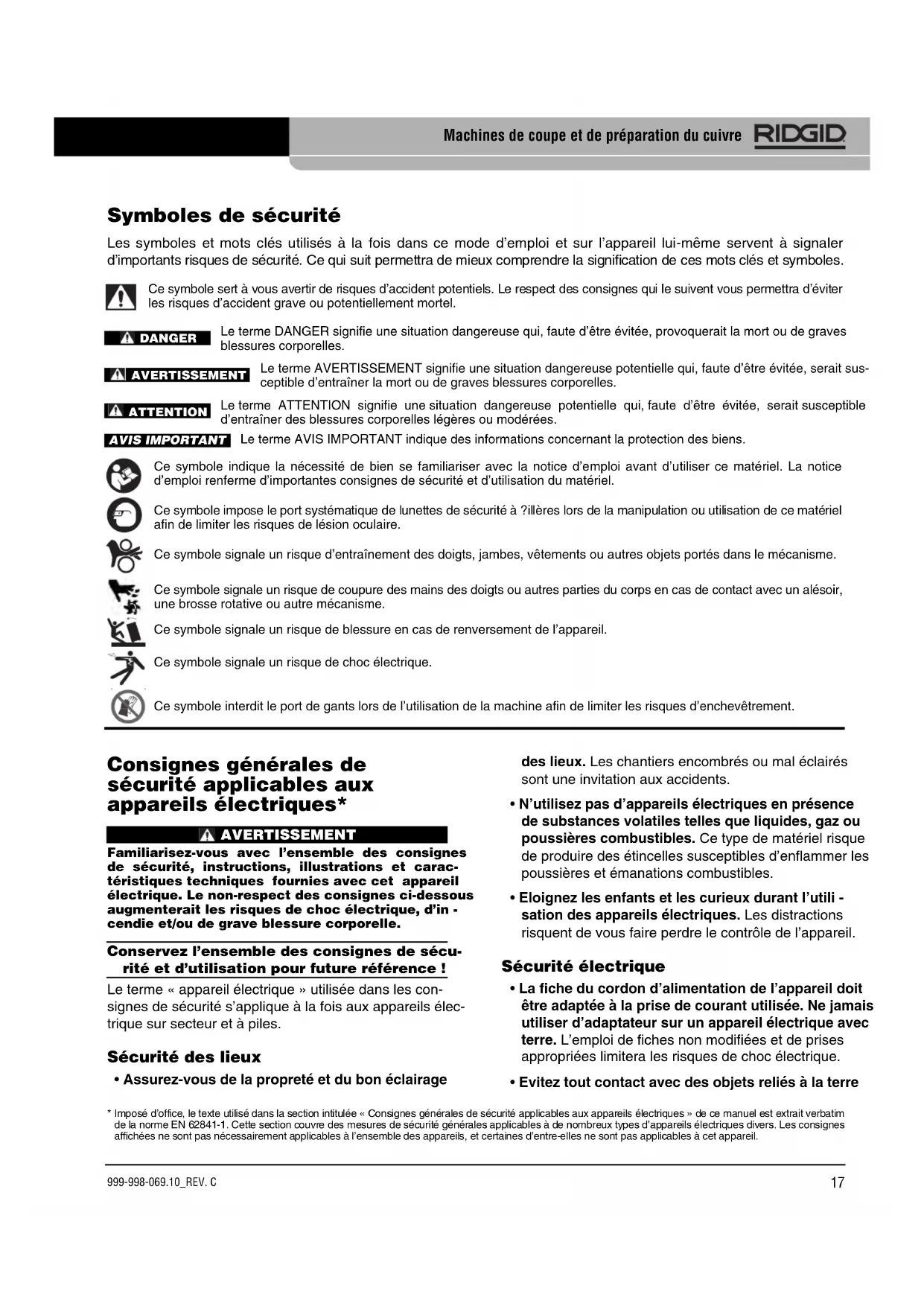 - Evitez tout contact avec des objets reliés à la terre Symboles de sécurité Les symboles et mots clés utilisés à la fois dans ce mode d’emploi et sur l’appareil lui-même servent à signaler d’importants risques de sécurité. Ce qui suit permettra de mieux comprendre la signification de ces mots clés et symboles. DANGER Ce symbole sert à vous avertir de risques d’accident potentiels. Le respect des consignes qui le suivent vous permettra d’éviter les risques d’accident grave ou potentiellement mortel. Le terme DANGER signifie une situation dangereuse qui, faute d’être évitée, provoquerait la mort ou de graves blessures corporelles. AVERTISSEMENT Le terme AVERTISSEMENT signifie une situation dangereuse potentielle qui, faute d’être évitée, serait sus- ceptible d’entraîner la mort ou de graves blessures corporelles. ATTENTION Le terme ATTENTION signifie une situation dangereuse potentielle qui, faute d’être évitée, serait susceptible d’entraîner des blessures corporelles légères ou modérées. Le terme AVIS IMPORTANT indique des informations concernant la protection des biens. Ce symbole indique la nécessité de bien se familiariser avec la notice d’emploi avant d’utiliser ce matériel. La notice d’emploi renferme d’importantes consignes de sécurité et d’utilisation du matériel. Ce symbole impose le port systématique de lunettes de sécurité à ?illères lors de la manipulation ou utilisation de ce matériel afin de limiter les risques de lésion oculaire. Ce symbole signale un risque d’entraînement des doigts, jambes, vêtements ou autres objets portés dans le mécanisme. Ce symbole signale un risque de coupure des mains des doigts ou autres parties du corps en cas de contact avec un alésoir, une brosse rotative ou autre mécanisme. AVIS IMPORTANT Ce symbole signale un risque de blessure en cas de renversement de l’appareil. Ce symbole interdit le port de gants lors de l’utilisation de la machine afin de limiter les risques d’enchevêtrement. Ce symbole signale un risque de choc électrique. Machines de coupe et de préparation du cuivre