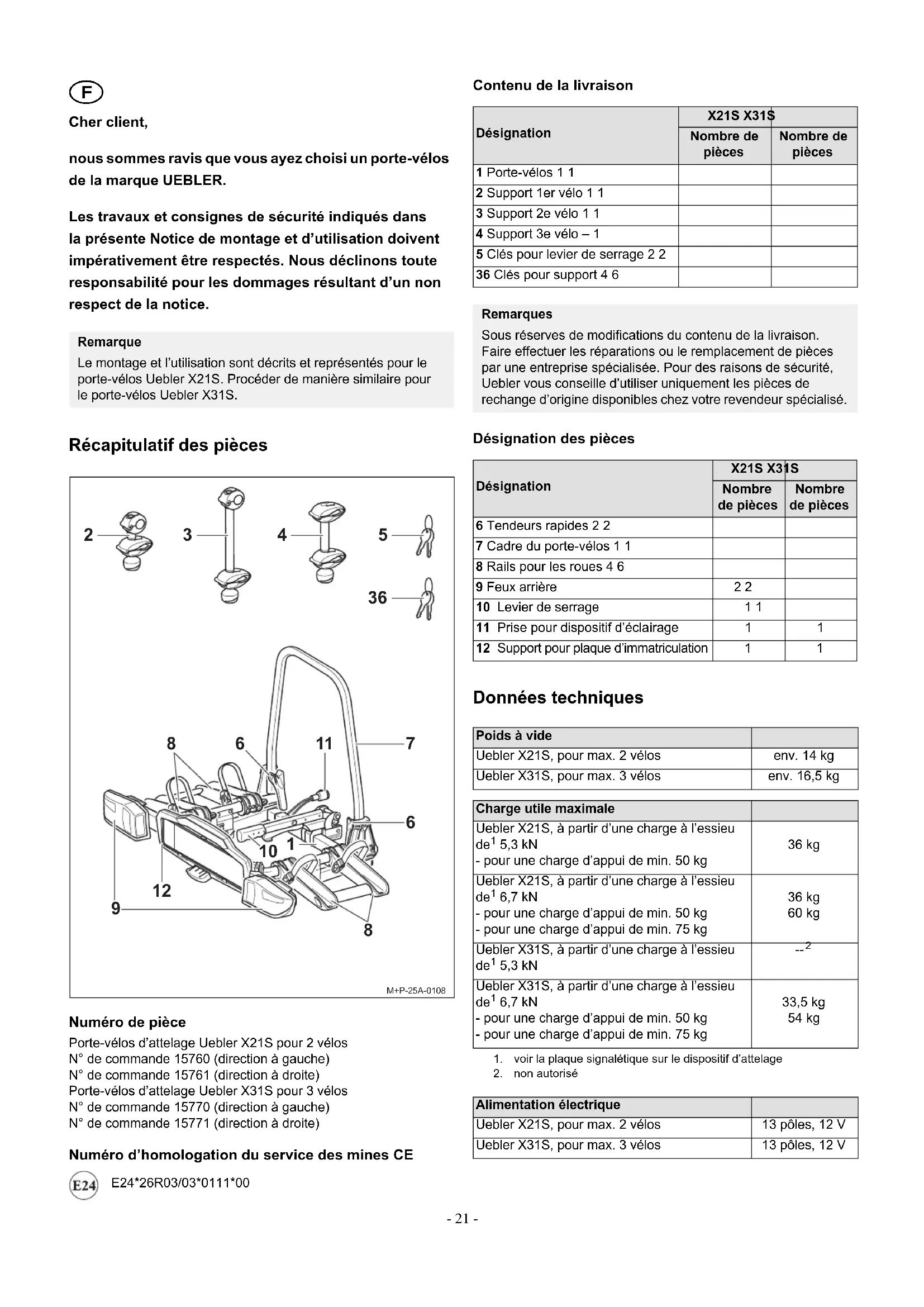 Cher client, nous sommes ravis que vous ayez choisi un porte-vélos de la marque UEBLER. Les travaux et consignes de sécurité indiqués dans la présente Notice de montage et d’utilisation doivent impérativement être respectés. Nous déclinons toute responsabilité pour les dommages résultant d’un non respect de la notice. Récapitulatif des pièces Numéro de pièce Porte-vélos d’attelage Uebler X21S pour 2 vélos N° de commande 15760 (direction à gauche) N° de commande 15761 (direction à droite) Porte-vélos d’attelage Uebler X31S pour 3 vélos N° de commande 15770 (direction à gauche) N° de commande 15771 (direction à droite) Numéro d’homologation du service des mines CE E24*26R03/03*0111*00 Contenu de la livraison Désignation des pièces Données techniques Remarque Le montage et l’utilisation sont décrits et représentés pour le porte-vélos Uebler X21S. Procéder de manière similaire pour le porte-vélos Uebler X31S.