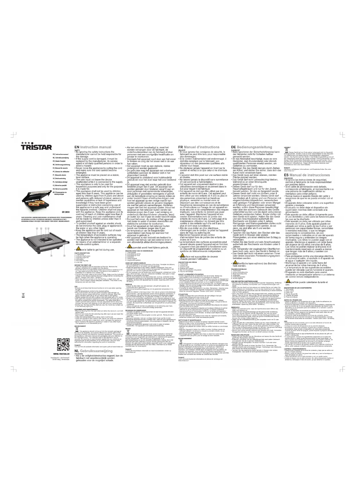 - La surface est susceptible de devenir chaude pendant l'utilisation. DESCRIPTION DES PIÈCES1. Thermostat2. Voyant vert3. Voyant rouge4. Plaques de cuisson5. Bac de récupération de graisse6. Clip de verrouillageAVANT LA PREMIÈRE UTILISATION• Sortez l'appareil et les accessoires hors de la boîte.Retirez lesautocollants, le film protecteur ou le plastique de l'appareil.• Mettez l'appareil sur une surface stable plate et assurez un dégagementtout autour de l'appareil d'au moins 10 cm. Cet appareil ne convient pasà une installation dans une armoire ou à un usage à l'extérieur.• Lorsque l'appareil est allumé pour la première fois, une légère odeur sedégage. Ceci est normal et gage d'une ventilation adéquate. Cette odeurest temporaire et disparaîtra vite.• Connectez le câble d'alimentation à la prise. (Remarque : Assurez-vousque la tension indiquée sur l'appareil correspond à la tension localeavant de connecter l'appareil. Tension 220V-240V~ 50-60Hz).UTILISATION• Vérifiez à chaque fois que la fonction de verrouillage n’est pasenclenchée lorsque que vous ouvrez le gril.• Réglez la température à votre convenance.• Branchez la fiche et les témoins rouge et vert s'allument. Laissezl'appareil fermé sans contenu pour le préchauffage. Lorsque le témoinvert s'éteint, vous pouvez commencer à griller.• Graissez légèrement le revêtement antiadhésif des plaques de cuissonavec de l’huile ou du beurre.• Placez alors les ingrédients préparés sur la plaque inférieure du grill etrefermez le gril en appuyant sur la poignée. La plaque supérieurebascule pour fournir une pression uniforme. Le temps de préparationnormale est d'environ 5 à 8 minutes: le temps exact dépend du plat etde votre goût personnel.• Pendant utilisation, les plateaux et le corps de l’appareil sont brûlants,évitez tout contact pour éviter les blessures graves.NETTOYAGE ET MAINTENANCE• Débranchez la fiche du secteur et laissez l’appareil refroidir ouvert.• Retirez et videz le bac de récupération de graisse après chaque usageet lavez-le à l'eau savonneuse chaude.• Nettoyez les plaques de cuisson avec un chiffon humide ou une brossedouce.• Nettoyez l'appareil à l'aide d'un chiffon humide. N'utilisez jamais denettoyant abrasif ni de tampon à récurer ou de laine d'acier, ce quipourrait endommager l'appareil.• N'immergez jamais l'appareil dans l'eau ou dans tout autre liquide.L'appareil n'est pas prévu pour un lavage au lave-vaisselle.ENVIRONNEMENTCet appareil ne doit pas être jeté avec les déchets ménagers à lafin de sa durée de vie, il doit être remis à un centre de recyclage pour lesappareils électriques et électroniques. Ce symbole sur l'appareil, lemanuel d'utilisation et l'emballage attire votre attention sur un pointimportant. Les matériaux utilisés dans cet appareil sont recyclables. Enrecyclant vos appareils, vous contribuez de manière significative à laprotection de notre environnement. Renseignez-vous auprès des autoritéslocales pour connaître les centres de collecte des déchets.SupportVous retrouvez toutes les informations et pièces de rechange surwww.tristar.eu! DEBedienungsanleitung SICHERHEIT