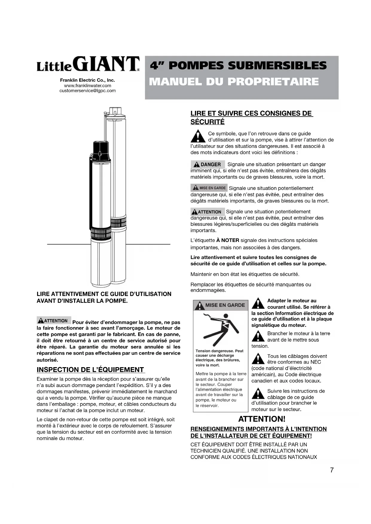 SÉCURITÉ Ce symbole, que l’on retrouve dans ce guide d’utilisation et sur la pompe, vise à attirer l’attention de l’utilisateur sur des situations dangereuses. Il est associé à des mots indicateurs dont voici les dénitions : DANGERSignale une situation présentant un danger imminent qui, si elle n’est pas évitée, entraînera des dégâts matériels importants ou de graves blessures, voire la mort.MISE EN GARDE Signale une situation potentiellement dangereuse qui, si elle n’est pas évitée, peut entraîner des dégâts matériels importants, de graves blessures ou la mort. ATTENTION Signale une situation potentiellement dangereuse qui, si elle n’est pas évitée, peut entraîner des blessures légères/supercielles ou des dégâts matériels importants.L’étiquette À NOTER signale des instructions spéciales importantes, mais non associées à des dangers.Lire attentivement et suivre toutes les consignes de sécurité de ce guide d’utilisation et celles sur la pompe.Maintenir en bon état les étiquettes de sécurité. Remplacer les étiquettes de sécurité manquantes ou endommagées.Adapter le moteur au courant utilisé. Se référer à la section Information électrique de ce guide d’utilisation et à la plaque signalétique du moteur.Brancher le moteur à la terre avant de le mettre sous tension.Tous les câblages doivent être conformes au NEC (code national d’électricité américain), au Code électrique canadien et aux codes locaux. Suivre les instructions de câblage de ce guide d’utilisation pour brancher le moteur sur le secteur. Tension dangereuse. Peutcauser une déchargeélectrique, des brûlures,voire la mort. Mettre la pompe à la terre avant de la brancher sur le secteur. Couper l’alimentation électrique avant de travailler sur la pompe, le moteur ou le réservoir.