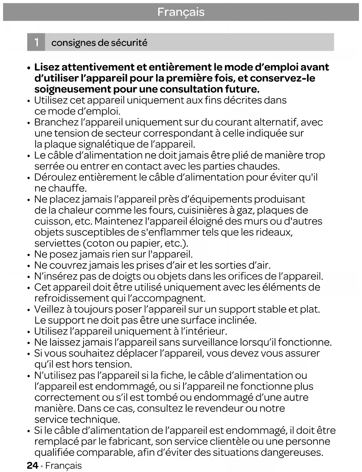 - Si le câble d’alimentation de l’appareil est endommagé, il doit être remplacé par le fabricant, son service clientèle ou une personne qualifiée comparable, afin d’éviter des situations dangereuses. Français consignes de sécurité