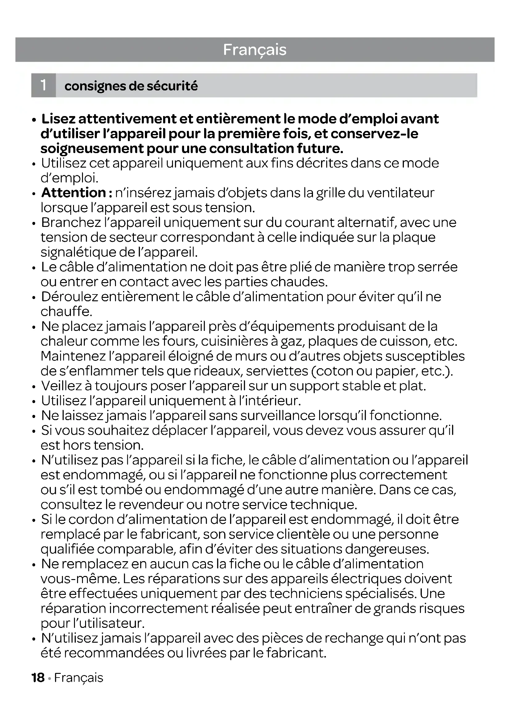 1. consignes de sécurité page 18