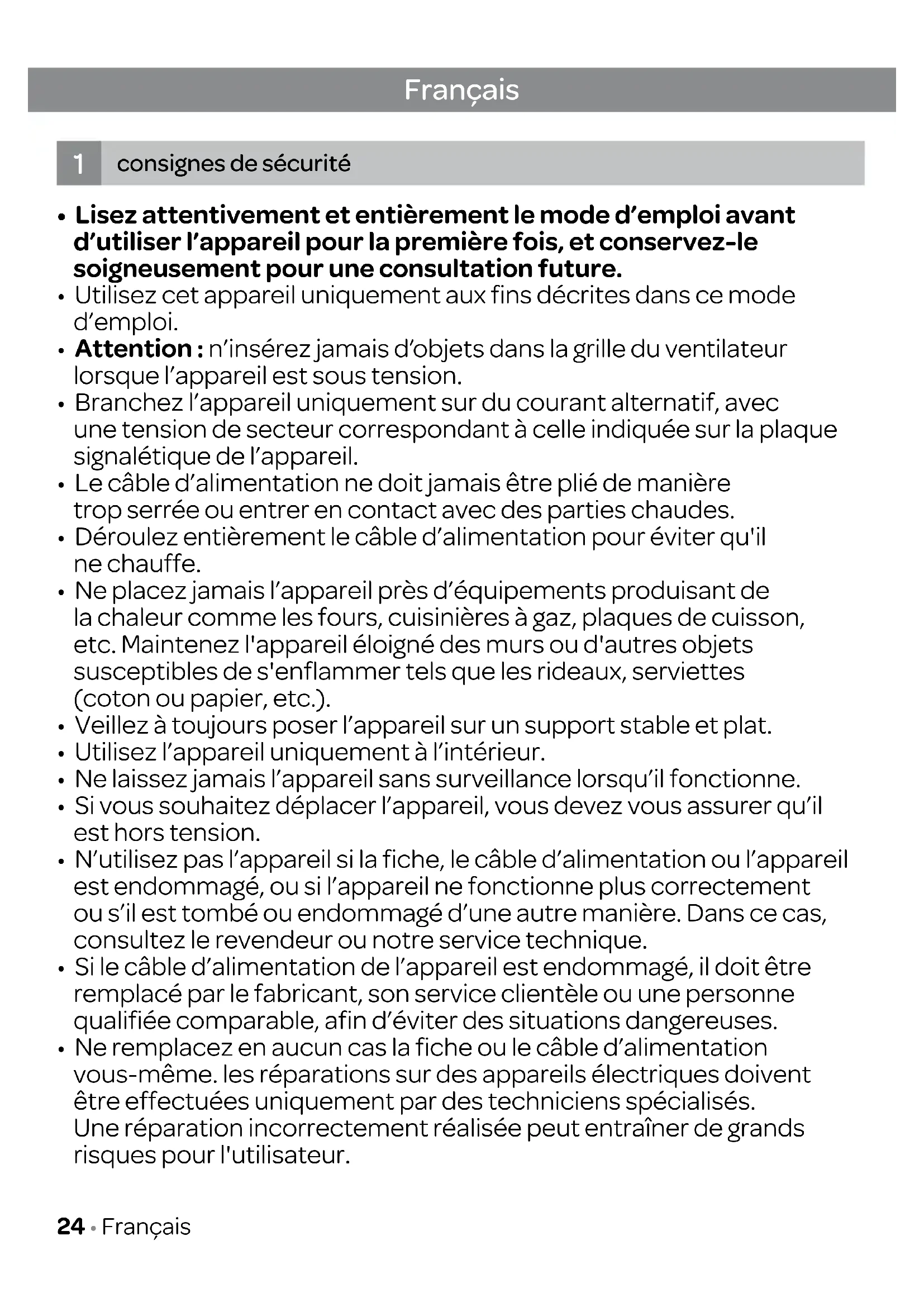 - Ne remplacez en aucun cas la fiche ou le câble d’alimentation vous-même. les réparations sur des appareils électriques doivent être effectuées uniquement par des techniciens spécialisés. Uneréparation incorrectement réalisée peut entraîner de grands risques pour l'utilisateur. 24 • Français• N’utilisez jamais l’appareil avec des pièces de rechange qui n’ont pas été recommandées ou livrées par le fabricant.