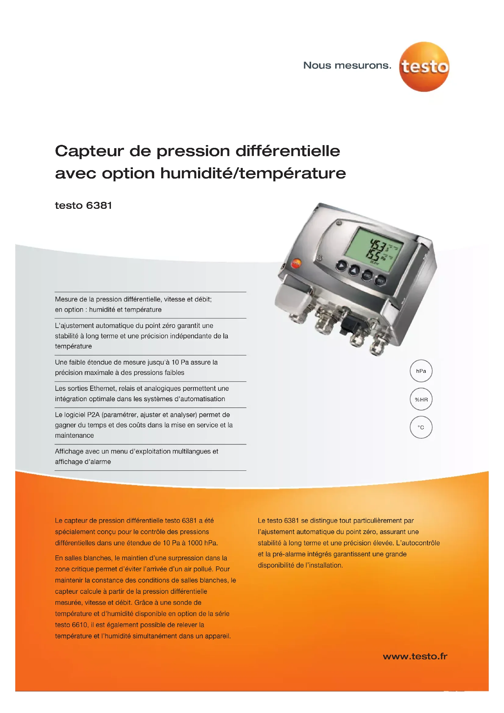 Mesure de la pression différentielle, vitesse et débit; en option : humidité et température L'ajustement automatique du point zéro garantit une stabilité à long terme et une précision indépendante de la température Une faible étendue de mesure jusqu'à 10 Pa assure la précision maximale à des pressions faibles Les sorties Ethernet, relais et analogiques permettent une intégration optimale dans les systèmes d'automatisation Le logiciel P2A (paramétrer, ajuster et analyser) permet de gagner du temps et des coûts dans la mise en service et la maintenance Affichage avec un menu d'exploitation multilangues et affichage d'alarme Capteur de pression différentielle avec option humidité/température testo 6381 Le capteur de pression différentielle testo 6381 a été spécialement conçu pour le contrôle des pressions différentielles dans une étendue de 10 Pa à 1000 hPa. En salles blanches, le maintien d’une surpression dans la zone critique permet d’éviter l’arrivée d’un air pollué. Pour maintenir la constance des conditions de salles blanches, le capteur calcule à partir de la pression différentielle mesurée, vitesse et débit. Grâce à une sonde de température et d'humidité disponible en option de la série testo 6610, il est également possible de relever la température et l’humidité simultanément dans un appareil. Le testo 6381 se distingue tout particulièrement par l’ajustement automatique du point zéro, assurant une stabilité à long terme et une précision élevée. L’autocontrôle et la pré-alarme intégrés garantissent une grande disponibilité de l’installation. www.testo.fr hPa Nous mesurons. %HR °Ctesto 6381 – Capteur de pression différentielle avec option humidité/température Nous mesurons. Données techniques Alimentation Sortie analogique Autres sorties Cadence de mesure 1/s Quantité Standard: 1; pour température/humidité (option: 3) Echelle Pression différentielle: mise à l'échelle: ±50% de l'étendue de mesure Résolution 12 bit Charge max. 500 Ω