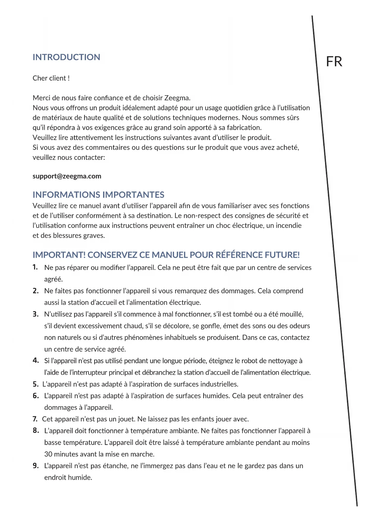 Le fotograe sono solo a scopo illustravo, l’aspeo reale dei prodo può dierire da quello mostrato nelle immagini.FR INTRODUCTION Cher client ! Merci de nous faire conance et de choisir Zeegma. Nous vous orons un produit idéalement adapté pour un usage quodien grâce à l’ulisaon de matériaux de haute qualité et de soluons techniques modernes. Nous sommes sûrs qu’il répondra à vos exigences grâce au grand soin apporté à sa fabricaon. Veuillez lire aenvement les instrucons suivantes avant d’uliser le produit. Si vous avez des commentaires ou des quesons sur le produit que vous avez acheté, veuillez nous contacter: support@zeegma.com INFORMATIONS IMPORTANTES Veuillez lire ce manuel avant d’uliser l’appareil an de vous familiariser avec ses foncons et de l’uliser conformément à sa desnaon. Le non-respect des consignes de sécurité et l’ulisaon conforme aux instrucons peuvent entraîner un choc électrique, un incendie et des blessures graves. IMPORTANT! CONSERVEZ CE MANUEL POUR RÉFÉRENCE FUTURE!