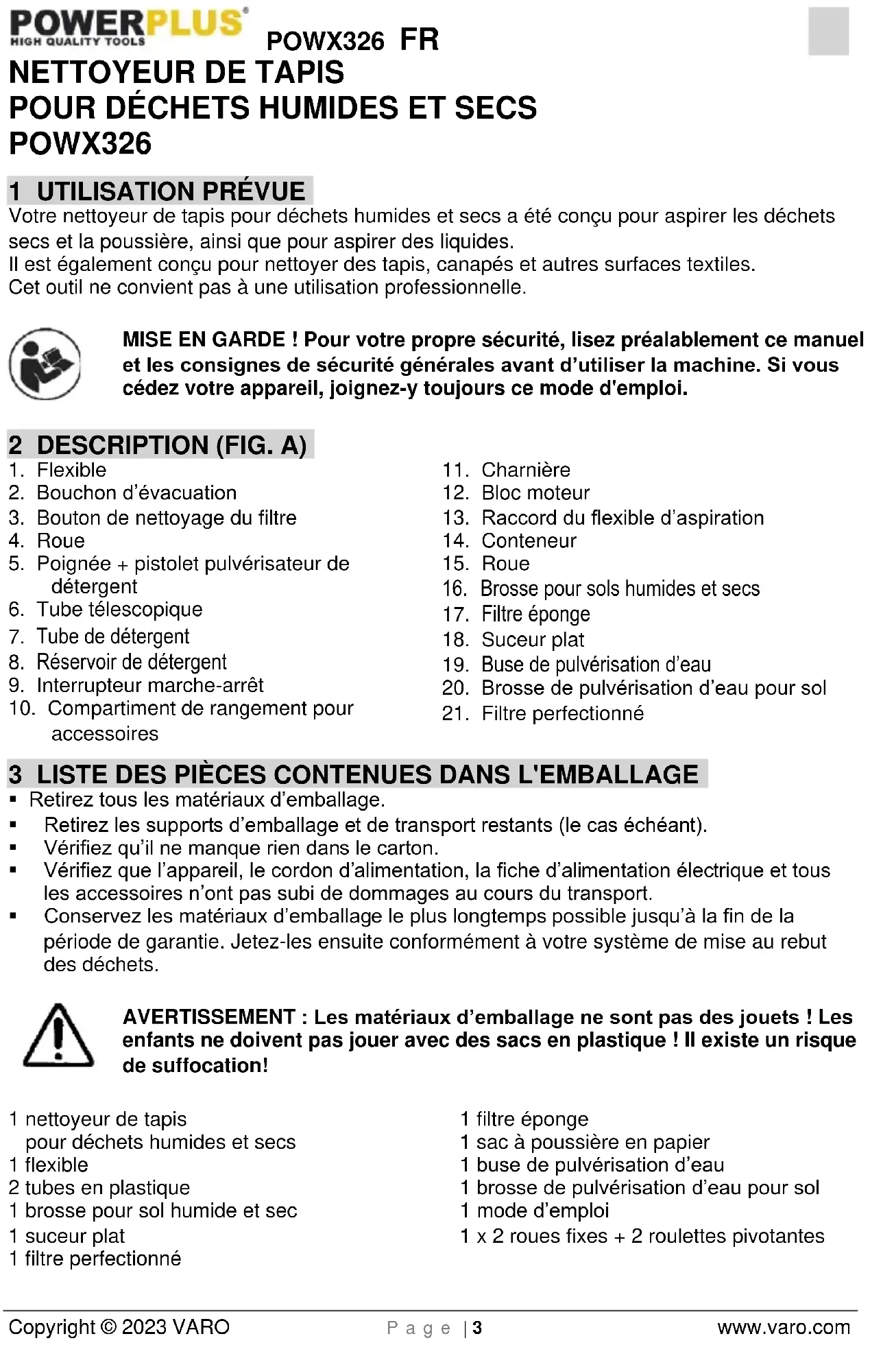 enfants ne doivent pas jouer avec des sacs en plastique ! Il existe un risque de suffocation! 1 nettoyeur de tapis pour déchets humides et secs 1 flexible 2 tubes en plastique 1 brosse pour sol humide et sec 1 suceur plat 1 filtre perfectionné 1 filtre éponge 1 sac à poussière en papier 1 buse de pulvérisation d’eau 1 brosse de pulvérisation d’eau pour sol 1 mode d’emploi 1 x 2 roues fixes + 2 roulettes pivotantesPOWX326 FR Copyright © 2023 VARO P a g e | 4 www.varo.com En cas de pièces manquantes ou endommagées, contactez votre revendeur. 4 PICTOGRAMMES Les symboles suivants sont utilisés dans ce mode d’emploi et/ou sur la machine :