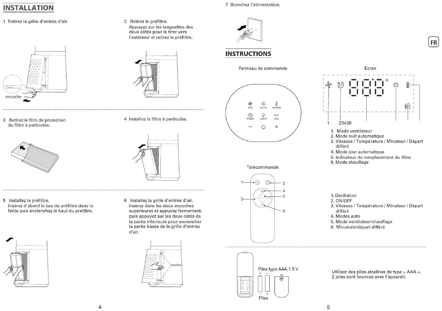 INSTALLATION 1 Retirez la grille d’entrée d’air.3 Retirez le film de protection du filtre à particules.5 Installez le préfiltre. Insérez d’abord le bas du préfiltre dans la fente puis enclenchez le haut du prefiltre.6 Installez la grille d’entrée d’air. Insérez dans les deux encoches supérieures et appuyez fermement, puis appuyez sur les deux côtés de la partie inférieure pour enclencher la partie basse de la grille d’entrée d’air.4 Installez le filtre à particules.2 Retirez le préfiltre. Appuyez sur les languettes des deux côtés pour le tirer vers l’extérieur et retirez le préfiltre.encocheencoches7 Branchez l’alimentation. INSTRUCTIONS Panneau de commandeTélécommandeÉcran