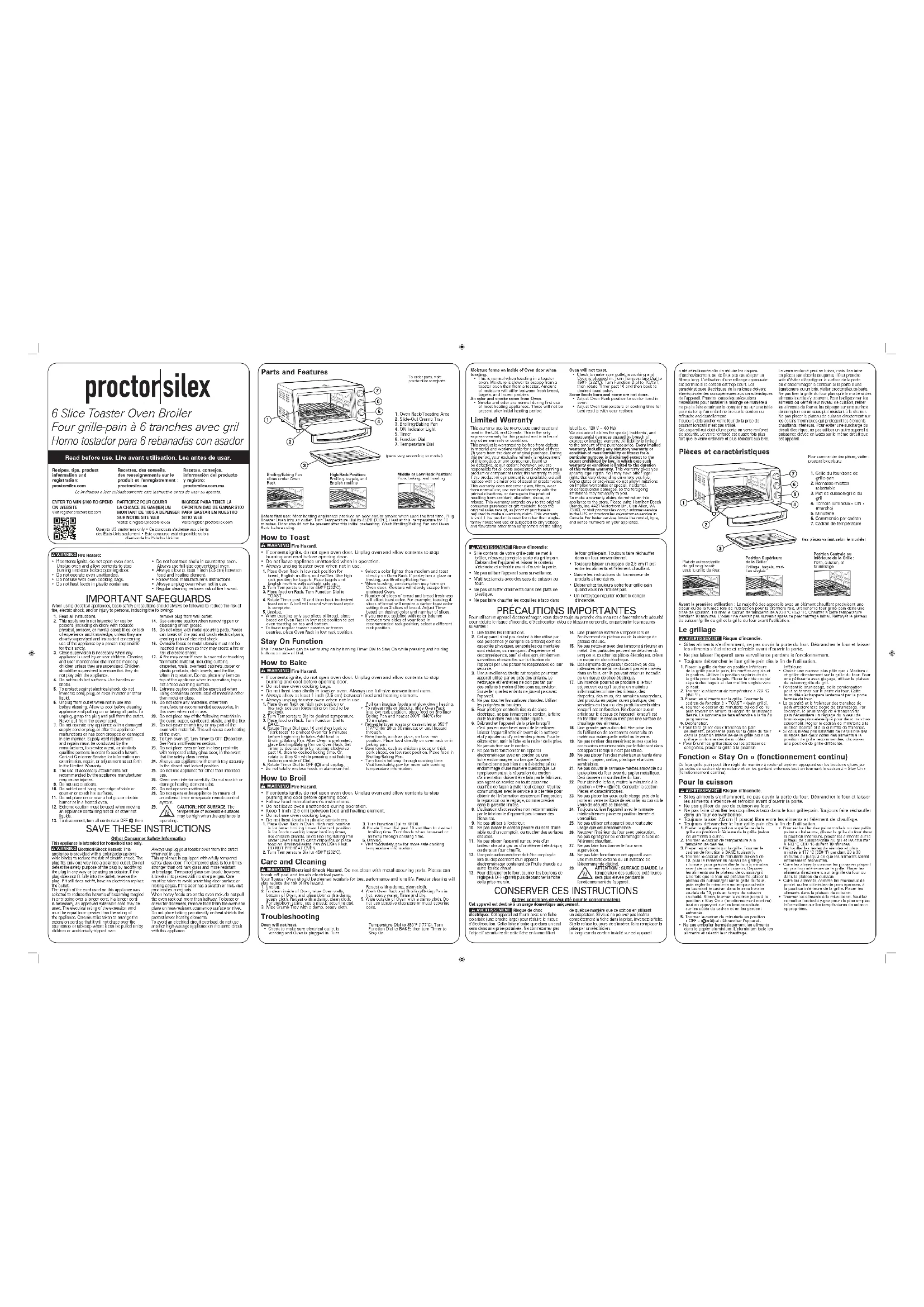 - Régler la température du four ou le temps de cuisson pour obtenir des résultats optimaux selon les recettes utilisées. Garantie limitée Cette garantie s’applique aux produits achetés et utilisées aux É.-U. et au Canada. C’est la seule garantie expresse pour ce produit et est en lieu et place de tout autre garantie ou condition. Ce produit est garanti contre tout défaut de matériaux et de main-d’oeuvre pour une période de trois (3) ans à compter de la date d’achat d’origine. Au cours de cette période, votre recours exclusif se limitera au remplacement de ce produit ou tout autre composant défectueux, à notre discrétion. Cependant, vous êtes responsables des frais associés au retour du produit ou d’un composant en vertu de la présente garantie. Si le produit ou le composant est non disponible, nous le remplacerons avec un article similaire de valeur égale ou supérieure. Cette garantie ne couvre pas le verre, les filtres, l’usure d’un usage normal, l’utilisation non conforme aux directives imprimées, ou des dommages au produit résultant d’un accident, modification, utilisation abusive ou incorrecte. Cette garantie s’applique seulement à l’acheteur original ou à la personne l’ayant reçu en cadeau. La présentation du reçu de vente d’origine comme preuve d’achat est nécessaire pour faire une réclamation au titre de cette garantie. Cette garantie s’annule si le produit est utilisé autrement que par une famille ou si l’appareil est soumis à toute tension ou forme d’onde différente des caractéristiques nominales précisées sur l’étiquette (par ex. : 120 V ~ 60 Hz). Nous excluons toutes les réclamations au titre de cette garantie pour les dommages spéciaux, consécutifs et indirects causés par la violation de garantie expresse ou implicite. Toute responsabilité est limitée au prix d’achat. Chaque garantie implicite, y compris toute garantie ou condition de qualité marchande ou d’adéquation à un usage particulier, est exonérée, sauf dans la mesure interdite par la loi, auquel cas la garantie ou condition est limitée à la durée de cette garantie écrite. Cette garantie vous donne des droits légaux précis. Vous pouvez avoir d’autres droits qui varient selon l’endroit où vous habitez. Certaines provinces ne permettent pas les limitations sur les garanties implicites ou les dommages spéciaux ou indirects de telle sorte que les limitations ci-dessus ne s’appliquent peut-être pas à votre cas. Pour faire une réclamation au titre de la garantie, veuillez ne pas retourner cet appareil au magasin. Veuillez nous écrire à Hamilton Beach Brands, Inc., Customer Service Department, 4421 Waterfront Dr., Glen Allen, VA 23060, ou visiter le site proctorsilex.com/customer-service aux États-Unis ou proctorsilex.ca/customer-service au Canada. Pour obtenir un service plus rapide, veuillez repérer les numéros de modèle, de type et de séries sur votre appareil. Posición Alta de la Rejilla: Asar, roscas, panecillos ingleses Posición Media o baja de la Rejilla: Pizza, cocer y tostar La bandeja para asar/hornear se desliza por debajo de la parrilla del horno.