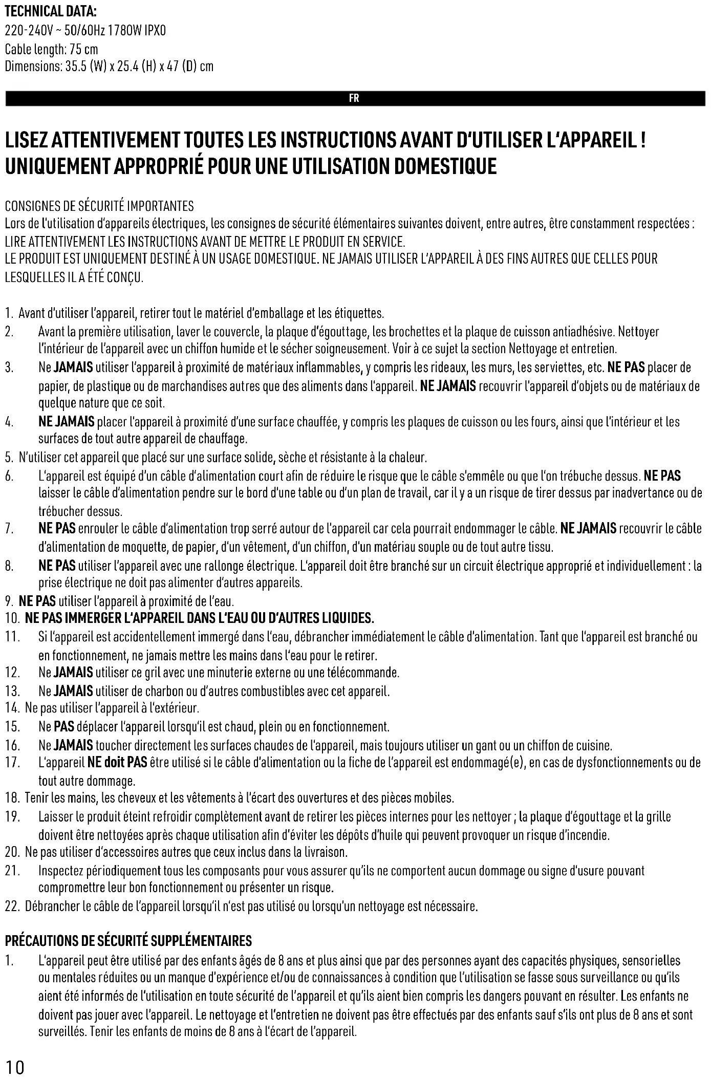 CARACTÉRISTIQUES TECHNIQUES : 220-240 V ~ 50/60 Hz 1780 W IPX0 Longueur du câble : 75 cm Dimensions : 35,5 (L) x 25,4 (H) x 47 (P) cm
