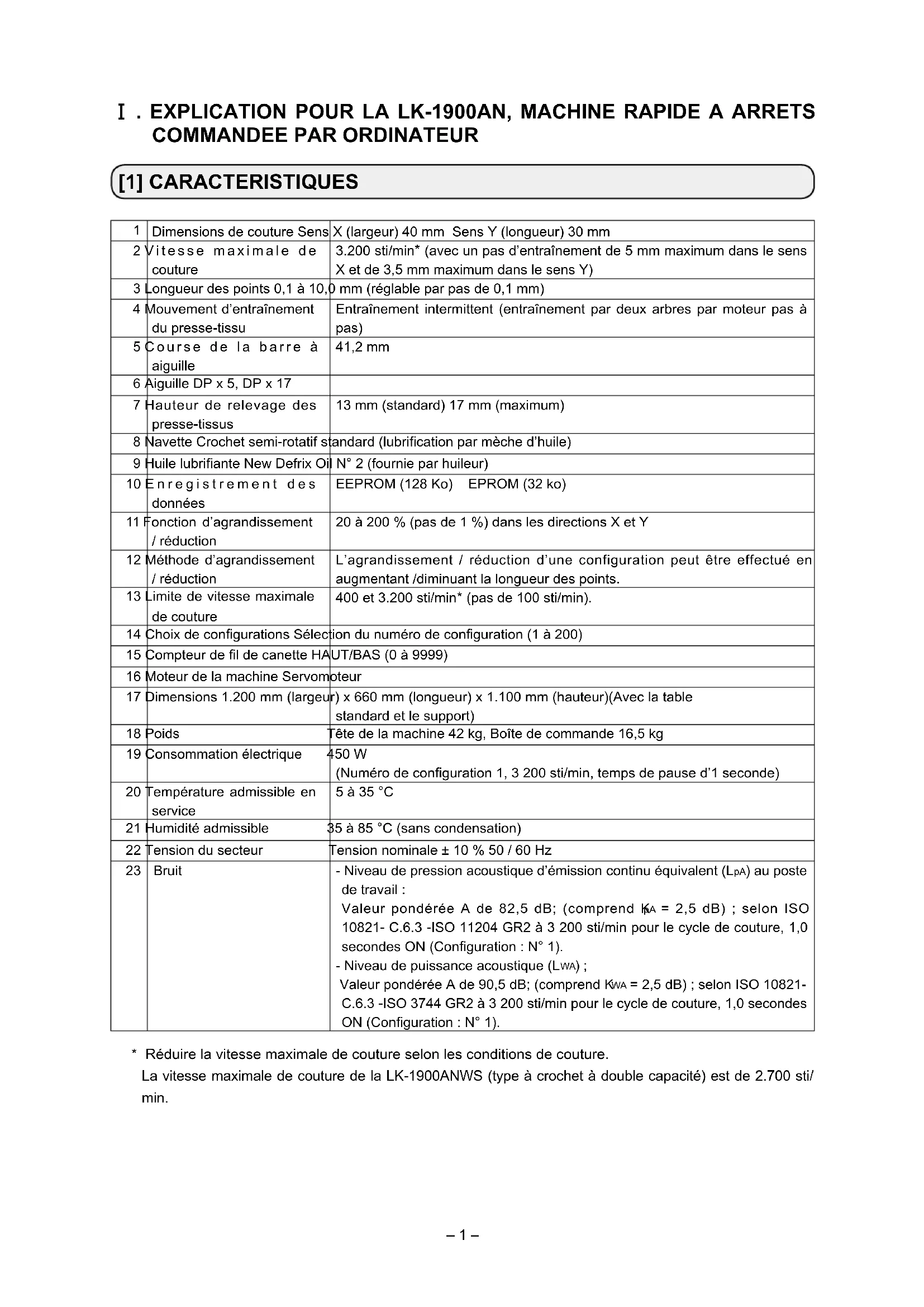 (avec un pas d’entraînement de 5 mm maximum dans le sens X et de 3,5 mm maximum dans le sens Y) 3 Longueur des points 0,1 à 10,0 mm (réglable par pas de 0,1 mm) 4 Mouvement d’entraînement du presse-tissu Entraînement intermittent (entraînement par deux arbres par moteur pas à pas) 5 Course de la barre à aiguille 41,2 mm 6 Aiguille DP x 5, DP x 17 7 Hauteur de relevage des presse-tissus 13 mm (standard) 17 mm (maximum) 8 Navette Crochet semi-rotatif standard (lubrication par mèche d’huile) 9 Huile lubriante New Defrix Oil N° 2 (fournie par huileur) 10 Enregistrement des données EEPROM (128 Ko) EPROM (32 ko) 11 Fonction d’agrandissement / réduction 20 à 200 % (pas de 1 %) dans les directions X et Y 12 Méthode d’agrandissement / réduction L’agrandissement / réduction d’une configuration peut être effectué en augmentant /diminuant la longueur des points. 13 Limite de vitesse maximale de couture 400 et 3.200 sti/min