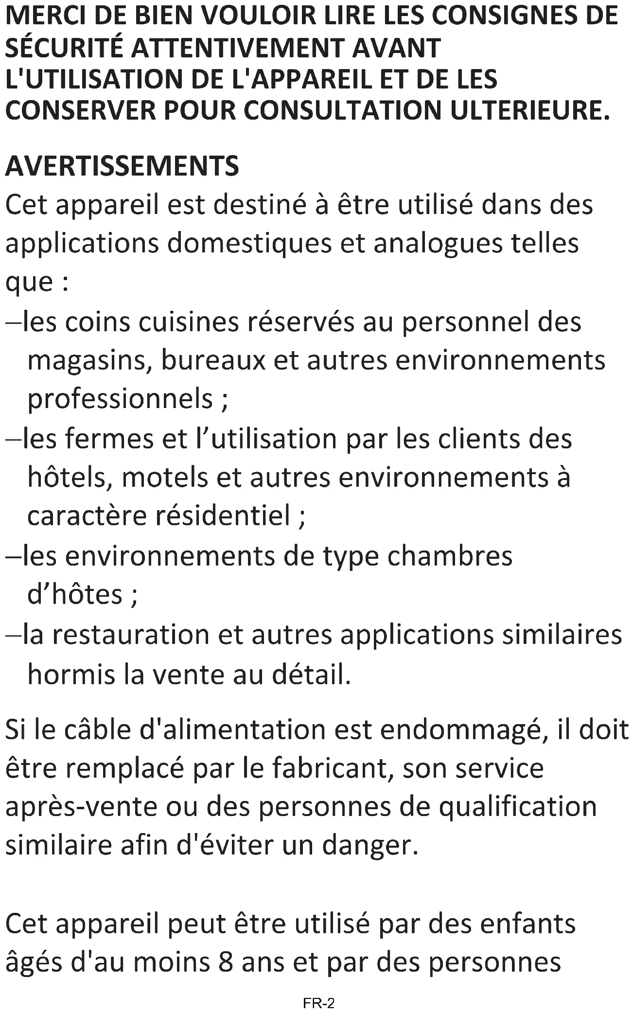 GUIDE DE DÉPANNAGE ........................................................................................................................... 26 SPÉCIFICATIONS .......................................................................................................................................27AVERTISSEMENTS Cet appareil est destiné à être utilisé dans des applications domestiques et analogues telles que : les coins cuisines réservés au personnel des magasins, bureaux et autres environnements professionnels ; les fermes et l’utilisation par les clients des hôtels, motels et autres environnements à caractère résidentiel ; les environnements de type chambres d’hôtes ; la restauration et autres applications similaires hormis la vente au détail. Si le câble d'alimentation est endommagé, il doit être remplacé par le fabricant, son service après-vente ou des personnes de qualification similaire afin d'éviter un danger. Cet appareil peut être utilisé par des enfants âgés d'au moins 8 ans et par des personnes MERCI DE BIEN VOULOIR LIRE LES CONSIGNES DE