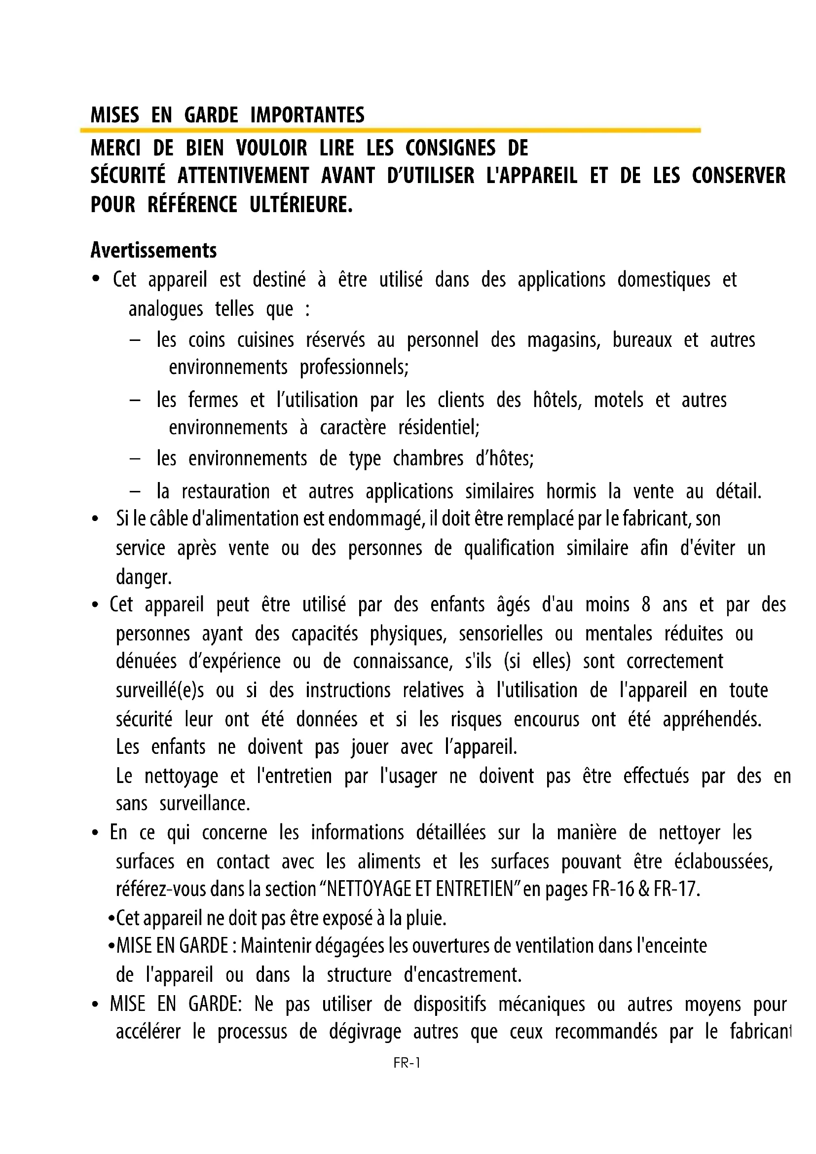- MISE AU REBUT Thomson et le logo Thomson sont des marques de Technicolor (S.A.) ou de ses filiales et sont utilisées sous licence par Ets Darty et Fils (S.A.).MISES EN GARDE IMPORTANTES MERCI DE BIEN VOULOIR LIRE LES CONSIGNES DE SÉCURITÉ ATTENTIVEMENT AVANT D’UTILISER L'APPAREIL ET DE LES CONSERVER POUR RÉFÉRENCE ULTÉRIEURE. Avertissements Cet appareil est destiné à être utilisé dans des applications domestiques et analogues telles que : ‒ les coins cuisines réservés au personnel des magasins, bureaux et autres environnements professionnels; ‒ les fermes et l’utilisation par les clients des hôtels, motels et autres environnements à caractère résidentiel; ‒ les environnements de type chambres d’hôtes; ‒ la restauration et autres applications similaires hormis la vente au détail. Si le câble d'alimentation est endommagé, il doit être remplacé par le fabricant, son service après vente ou des personnes de qualification similaire afin d'éviter un danger. Cet appareil peut être utilisé par des enfants âgés d'au moins 8 ans et par des personnes ayant des capacités physiques, sensorielles ou mentales réduites ou dénuées d’expérience ou de connaissance, s'ils (si elles) sont correctement surveillé(e)s ou si des instructions relatives à l'utilisation de l'appareil en toute sécurité leur ont été données et si les risques encourus ont été appréhendés. Les enfants ne doivent pas jouer avec l’appareil. Le nettoyage et l'entretien par l'usager ne doivent pas être effectués par des enfants sans surveillance. En ce qui concerne les informations détaillées sur la manière de nettoyer les surfaces en contact avec les aliments et les surfaces pouvant être éclaboussées, référez-vous dans la section “NETTOYAGE ET ENTRETIEN” en pages FR-16 & FR-17. Cet appareil ne doit pas être exposé à la pluie. MISE EN GARDE : Maintenir dégagées les ouvertures de ventilation dans l'enceinte de l'appareil ou dans la structure d'encastrement. MISE EN GARDE: Ne pas utiliser de dispositifs mécaniques ou autres moyens pour accélérer le processus de dégivrage autres que ceux recommandés par le fabricant. FR-1 MISE EN GARDE : Ne pas endommager le circuit de réfrigération. MISE EN GARDE : Ne pas utiliser d'appareils électriques à l'intérieur du compartiment de stockage des denrées, à moins qu'ils ne soient du type recommandé par le fabricant. Ne pas stocker dans cet appareil des substances explosives telles que des aérosols contenant des gaz propulseurs in ammables. MISE EN GARDE : Le système de réfrigération est sous haute pression. Ne pas y toucher. Contacter des serv i ces d’entretien qualiés avan t la mise au rebut. INSTALLATION : N'INSTALLEZ PAS CET APPAREIL DANS DES PIECES TROP HUMIDES OU TROP FROIDES, TELLES QUE DES CONSTRUCTIONS ANNEXES, GARAGES ou CAVES. Mise au rebut de l’appa reil : Pour éviter toute nuisance envers l’en vironnement ou la santé humaine causée par la mise au rebut non contrôlée de déchets électriques, les uides frigorigènes et les agents moussants inammables, rec yclez l’appareil de façon responsable pour promouvoir la réutilisation des ressources matérielles. La mise au rebut doit être faite de façon sûre dans des points de collecte publique prévus à cet eet, contactez le c entre de traitement des déchets le pl us près de chez vous pour plus de détails sur les procédures correctes de mise au rebut. Installation et mise en service : L’appareil doit être instal lé sur le sol, sur une surface plane et horizontale en s’assurant que les ouvertu res d’aération sont correctement dégagées. Ne jamais essayer de remplacer ou de réparer vous-même un e partie ou un composant de l’appareil, demandez de l’aide à un personnel professionnel et qualié, si besoin. Manipulation : Toujours mani puler l ’appareil avec soin an d ’éviter d’endommager celui-ci. MISE EN GARDE: Pour l a fabrication de glaçons, utilisez uniquemen t de l’eau potable. Ne congelez des aliments décongelés qu'après les avoir cuits, an d'éliminer les bactéries noci ves. Ne recongelez jamais des fruits de mer qui ont été décongelés. Danger; risque d’incendie / matières inammables p. 22