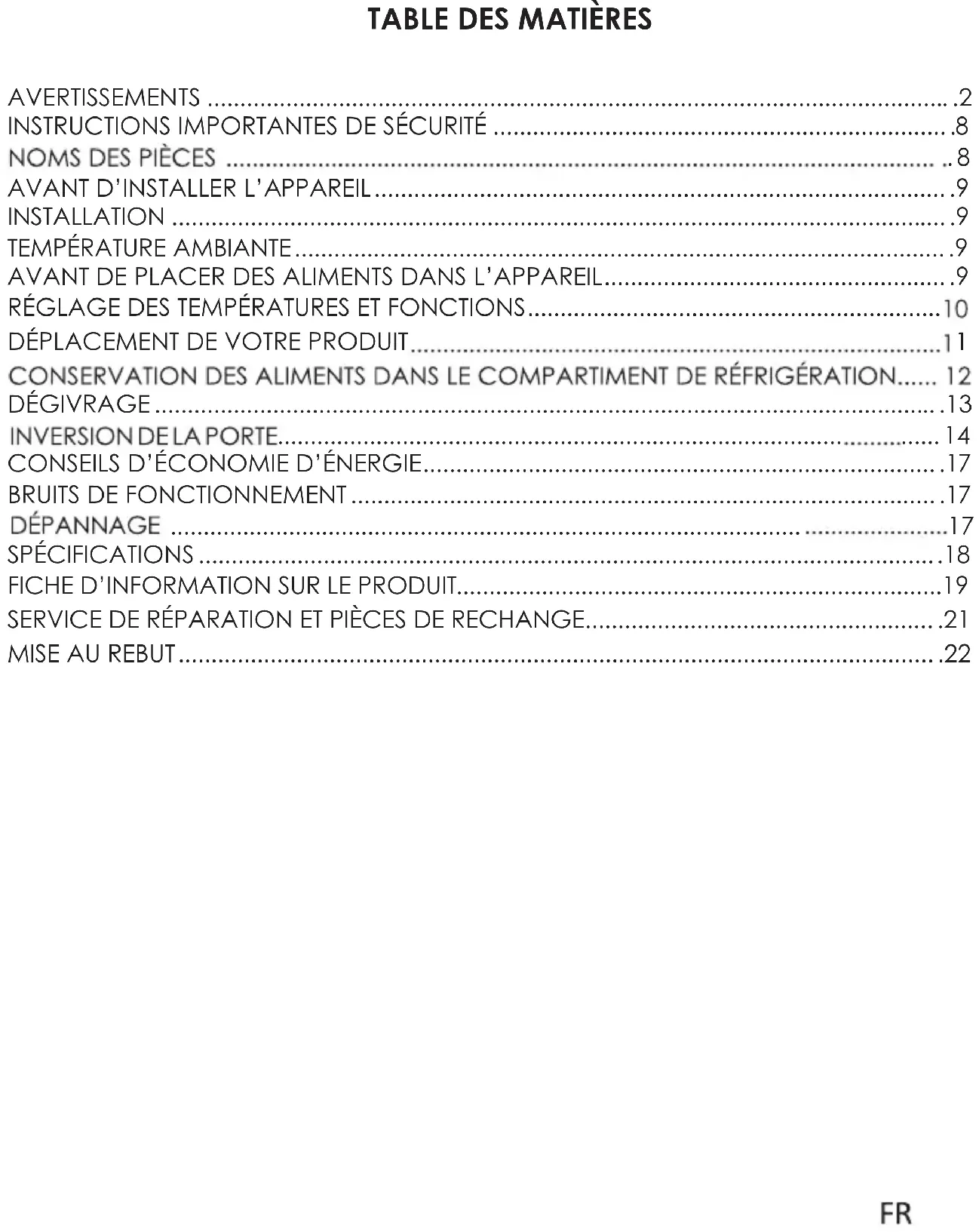Cet appareil ne doit pas être exposé à la pluie. MISE EN GARDE : Maintenir dégagées les ouvertures de v entilation dans l'enceinte de l'appareil ou dans la structure d'encastrement. MISE EN GARDE : Ne pas utiliser de dispositifs mécaniques ou autres mo yens pour accélérer le FR-3processus de dégivrage autres que ceux recommandés par le fabricant. MISE EN GARDE : Ne pas endommager le circuit de réfrigération. MISE EN GARDE : Ne pas utiliser d'appareils électriques à l'intérieur du compartiment de stockage des denrées, à moins qu'ils ne soient du type recommandé par le fabricant. Ne pas stocker dans cet appareil des substances explosives telles que des aérosols contenant des gaz propulseurs inflammables. MISE EN GARDE : Le système de réfrigération es