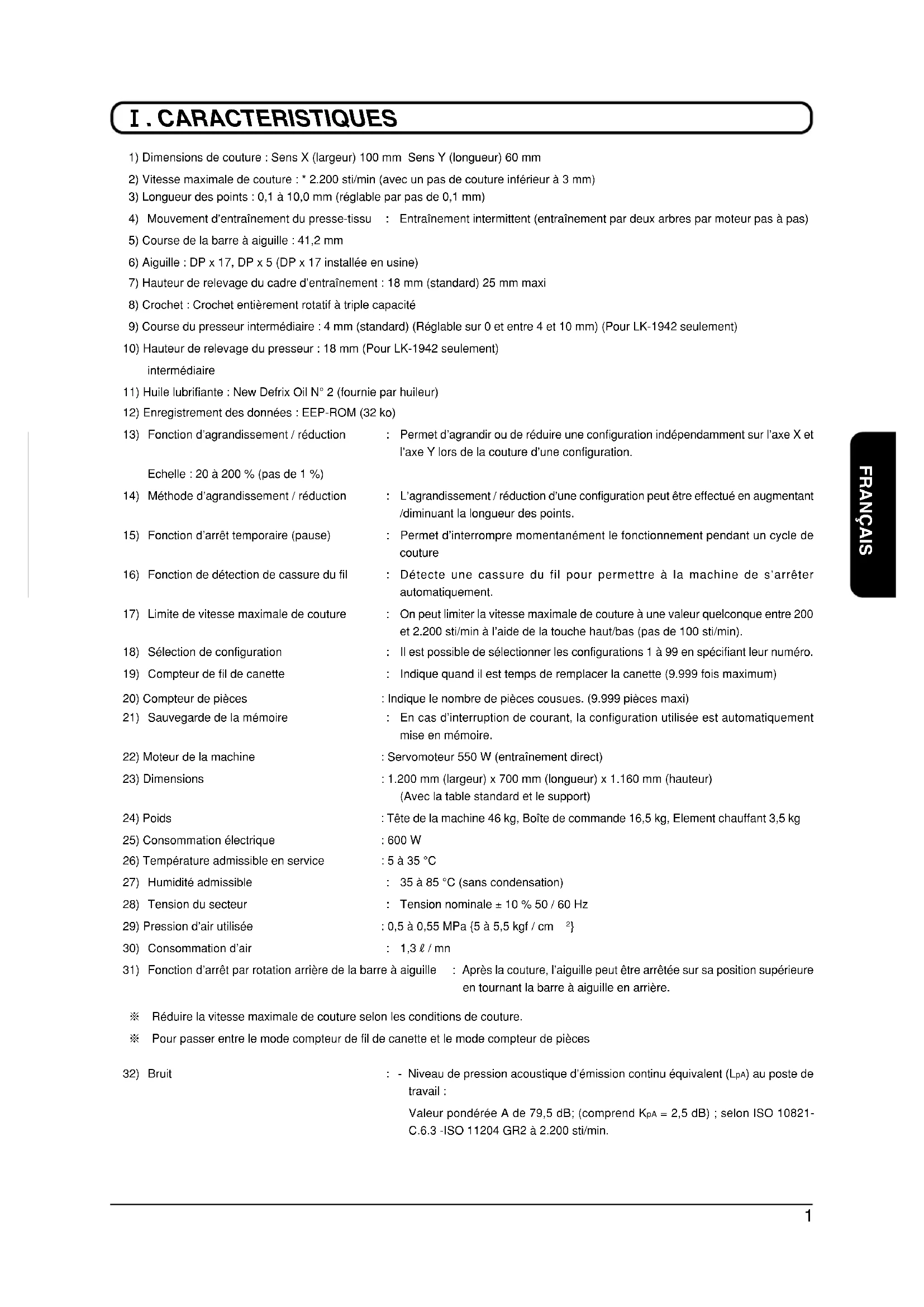 - duit risque de causer des interférences radio, auquel cas l’utilisateur peut être requis de prendre des mesures correctives.vi FRANÇAIS Dispositifs de sécurité et étiquettes d’avertissement Interrupteur d’alimentation Il s’agit d’un bouton pour couper le courant de la machine à cou- dre de l’alimentation électrique. Interrupteur d’alimentation (type européen) Ce bouton est utilisé pour couper le cou- rant de la machine à coudre de l’alimenta- tion électrique. Il sert également comme interrupteur d’arrêt d’urgence. Choix de l’interrupteur d’alimentation Veiller à utiliser l’interrup- teur d'alimentation conforme IEC60204-1 avec un courant nominal de 20 A ou plus et une capacité de coupure en court- circuit de 120 A ou plus, dont la section de fonctionnement est en rouge sur fond jaune. Par ailleurs, il faut savoir que les dispositifs de sécurité comme le « couvercle du protège-yeux » et le « pare-aiguille » sont quelquefois omis dans les schémas, illustrations et fi gures fournis dans le mode d'emploi pour plus de clarté. Dans la pratique, ne jamais retirer ces dispositifs de sécurité. Attention Étiquette de dan- ger d’électrocution (Type euro- péen) (Se re- porter à « Étiquette de danger d’électro- cution » à la page i.) Afi n de se protéger d’une électrocu- tion, des précau- tions de sécurité à prendre pour écarter le danger sont mentionnées sur cette étiquette. Pare-aiguille Il s’agit d’un couvercle empêchant le contact entre les doigts et l’ aiguille. Couvercle du protège-yeux Il s’agit d’un couvercle pour empêcher les yeux d’être blessés par une aiguille cassée. Étiquette d’avertissement pour éviter de se pincer Cette étiquette avertit que les mains peuvent être pincées sous la machine à coudre. Couvercle du levier releveur de fi ls Il s’agit d’un couvercle empêchant le contact entre le corps humain et le levier releveur de fi ls. Étiquette d’avertissement pour éviter de se pincer Cette étiquette avertit que les doigts ou d’autres parties du corps humain peuvent être pin- cés dans le levier releveur de fi ls. Étiquette d’avertissement (Se re- porter à l’ étiquette d’avertis- sement en page i.) L’étiquette fournit les précautions minima- les à prendre lors de l’utilisation de la machine à coudre. Étiquette d’avertissement pour éviter de se pincer Cette étiquette indique un risque de pincement des mains entre la tête de la machine et le support d'entraînement. Couvercle du moteur Il s’agit d’un couvercle em- pêchant le contact entre le corps humain et le moteur et l’aimant.i FRANÇAIS SOMMAIRE !. CARACTERISTIQUES p. 1