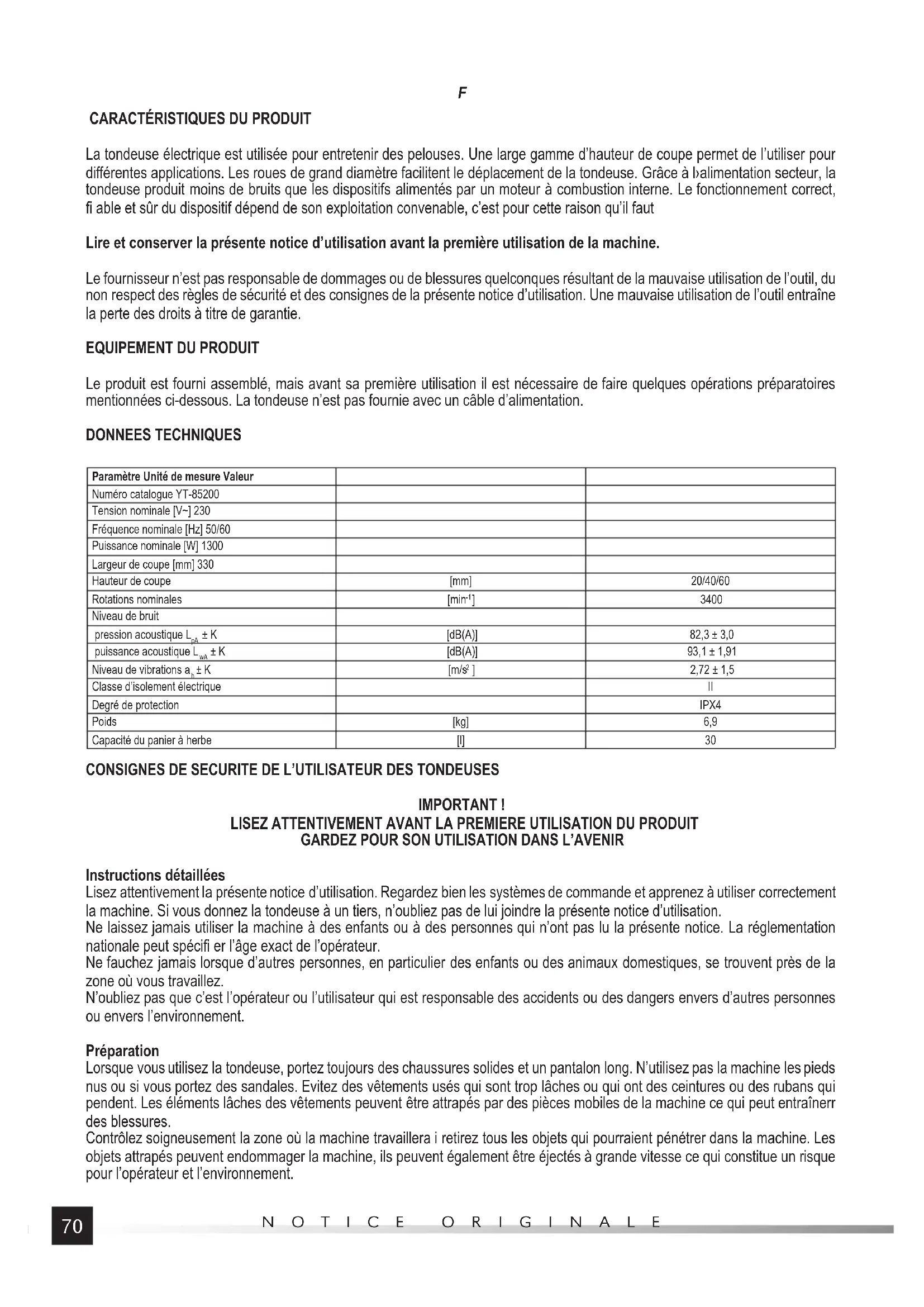 Le produit est fourni assemblé, mais avant sa première utilisation il est nécessaire de faire quelques opérations préparatoires mentionnées ci-dessous. La tondeuse n’est pas fournie avec un câble d’alimentation. DONNEES TECHNIQUES Paramètre Unité de mesure Valeur Numéro catalogue YT-85200 Tension nominale [V~] 230 Fréquence nominale [Hz] 50/60 Puissance nominale [W] 1300 Largeur de coupe [mm] 330 Hauteur de coupe [mm] 20/40/60 Rotations nominales [min