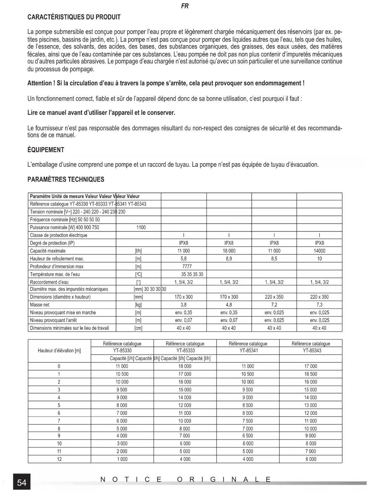 NOTICE ORIGINALE Hauteur d’élévation [m] Référence catalogue Référence catalogue Référence catalogue Référence catalogue YT-85330 YT-85333 YT-85341 YT-85343 Capacité [l/h] Capacité [l/h] Capacité [l/h] Capacité [l/h]
