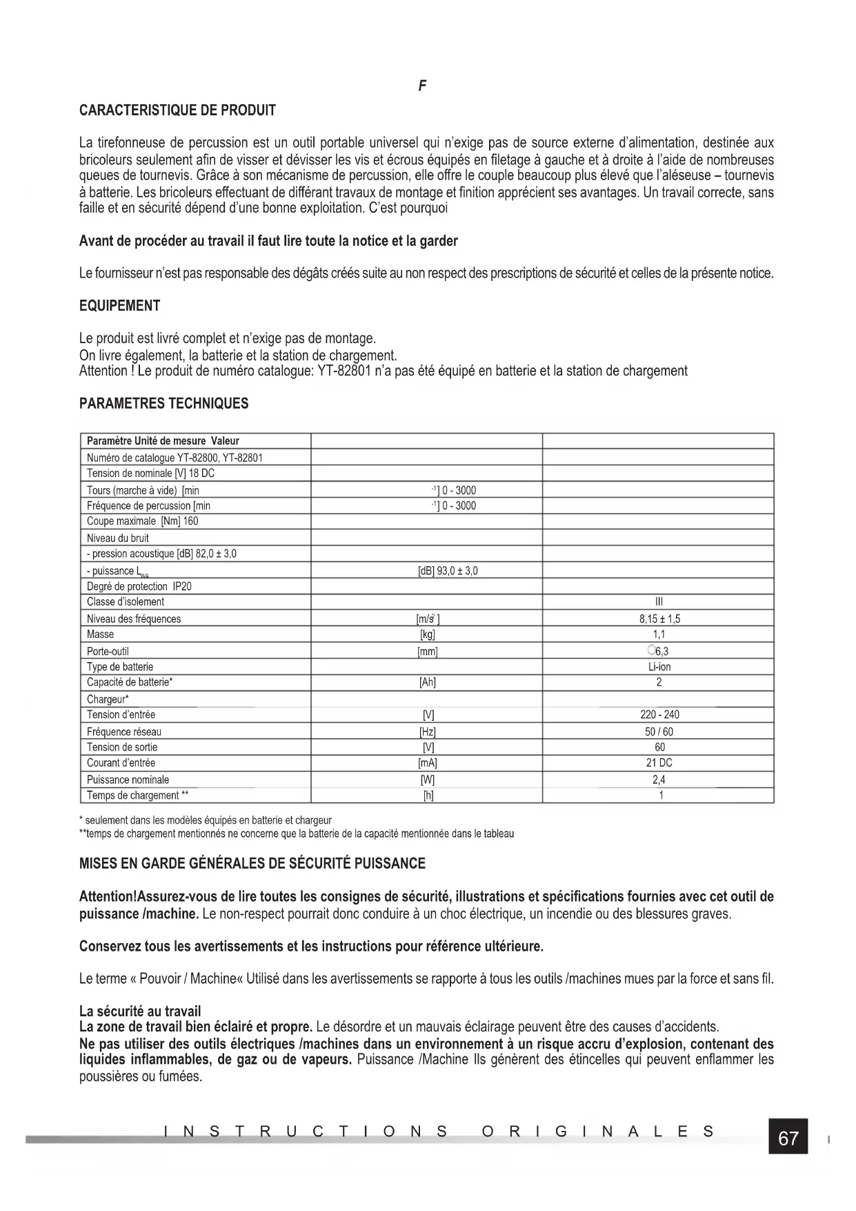 La tirefonneuse de percussion est un outil portable universel qui n’exige pas de source externe d’alimentation, destinée aux bricoleurs seulement afi n de visser et dévisser les vis et écrous équipés en fi letage à gauche et à droite à l’aide de nombreuses queues de tournevis. Grâce à son mécanisme de percussion, elle off re le couple beaucoup plus élevé que l’aléseuse – tournevis à batterie. Les bricoleurs eff ectuant de diff érant travaux de montage et fi nition apprécient ses avantages. Un travail correcte, sans faille et en sécurité dépend d’une bonne exploitation. C’est pourquoi Avant de procéder au travail il faut lire toute la notice et la garder Le fournisseur n’est pas responsable des dégâts créés suite au non respect des prescriptions de sécurité et celles de la présente notice. EQUIPEMENT Le produit est livré complet et n’exige pas de montage. On livre également, la batterie et la station de chargement. Attention ! Le produit de numéro catalogue: YT-82801 n’a pas été équipé en batterie et la station de chargement PARAMETRES TECHNIQUES Paramètre Unité de mesure Valeur Numéro de catalogue YT-82800, YT-82801 Tension de nominale [V] 18 DC Tours (marche à vide) [min