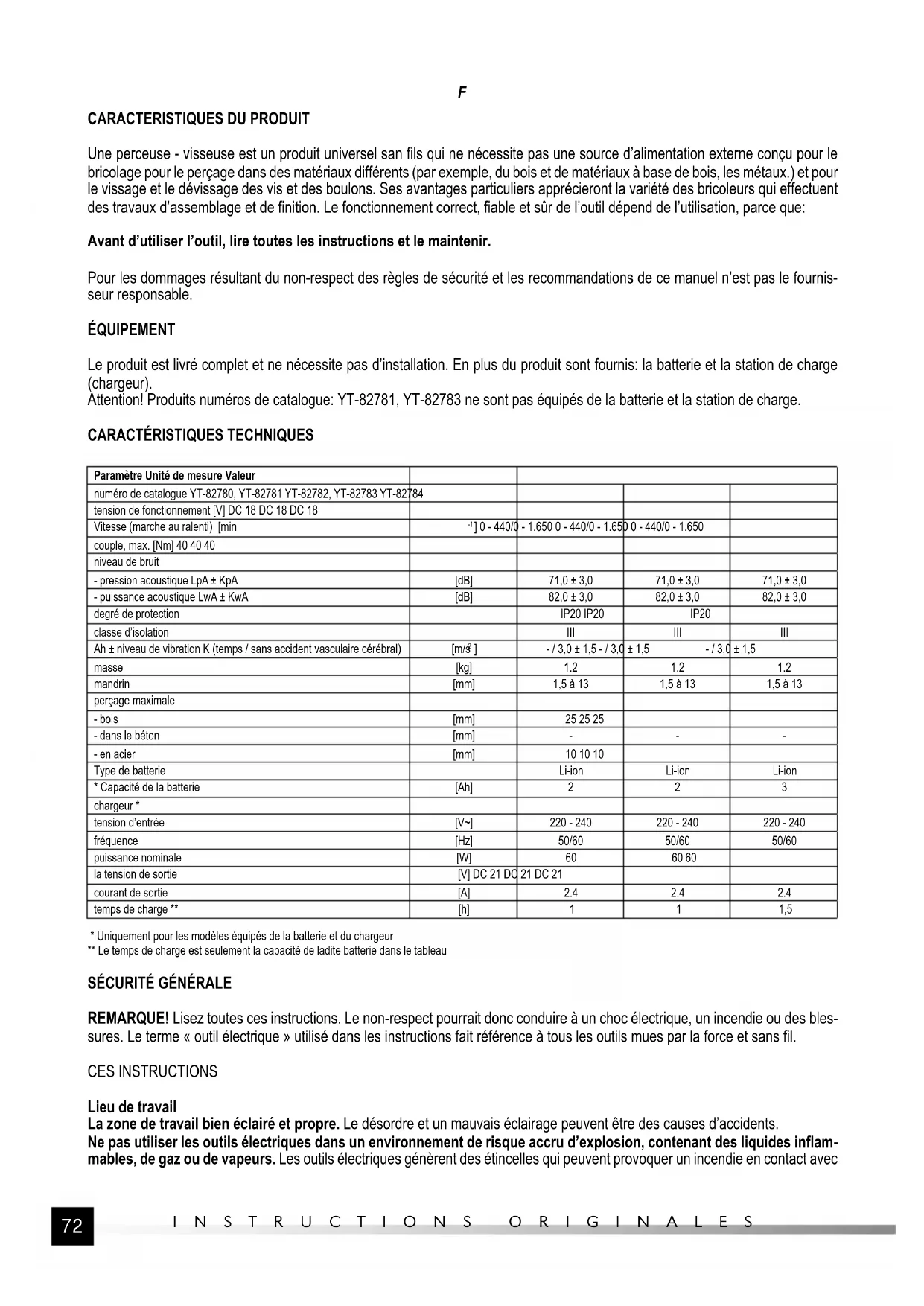 Une perceuse - visseuse est un produit universel san fils qui ne nécessite pas une source d’alimentation externe conçu pour le bricolage pour le perçage dans des matériaux différents (par exemple, du bois et de matériaux à base de bois, les métaux.) et pour le vissage et le dévissage des vis et des boulons. Ses avantages particuliers apprécieront la variété des bricoleurs qui effectuent des travaux d’assemblage et de finition. Le fonctionnement correct, fiable et sûr de l’outil dépend de l’utilisation, parce que: Avant d’utiliser l’outil, lire toutes les instructions et le maintenir. Pour les dommages résultant du non-respect des règles de sécurité et les recommandations de ce manuel n’est pas le fournis- seur responsable. ÉQUIPEMENT Le produit est livré complet et ne nécessite pas d’installation. En plus du produit sont fournis: la batterie et la station de charge (chargeur). Attention! Produits numéros de catalogue: YT-82781, YT-82783 ne sont pas équipés de la batterie et la station de charge.