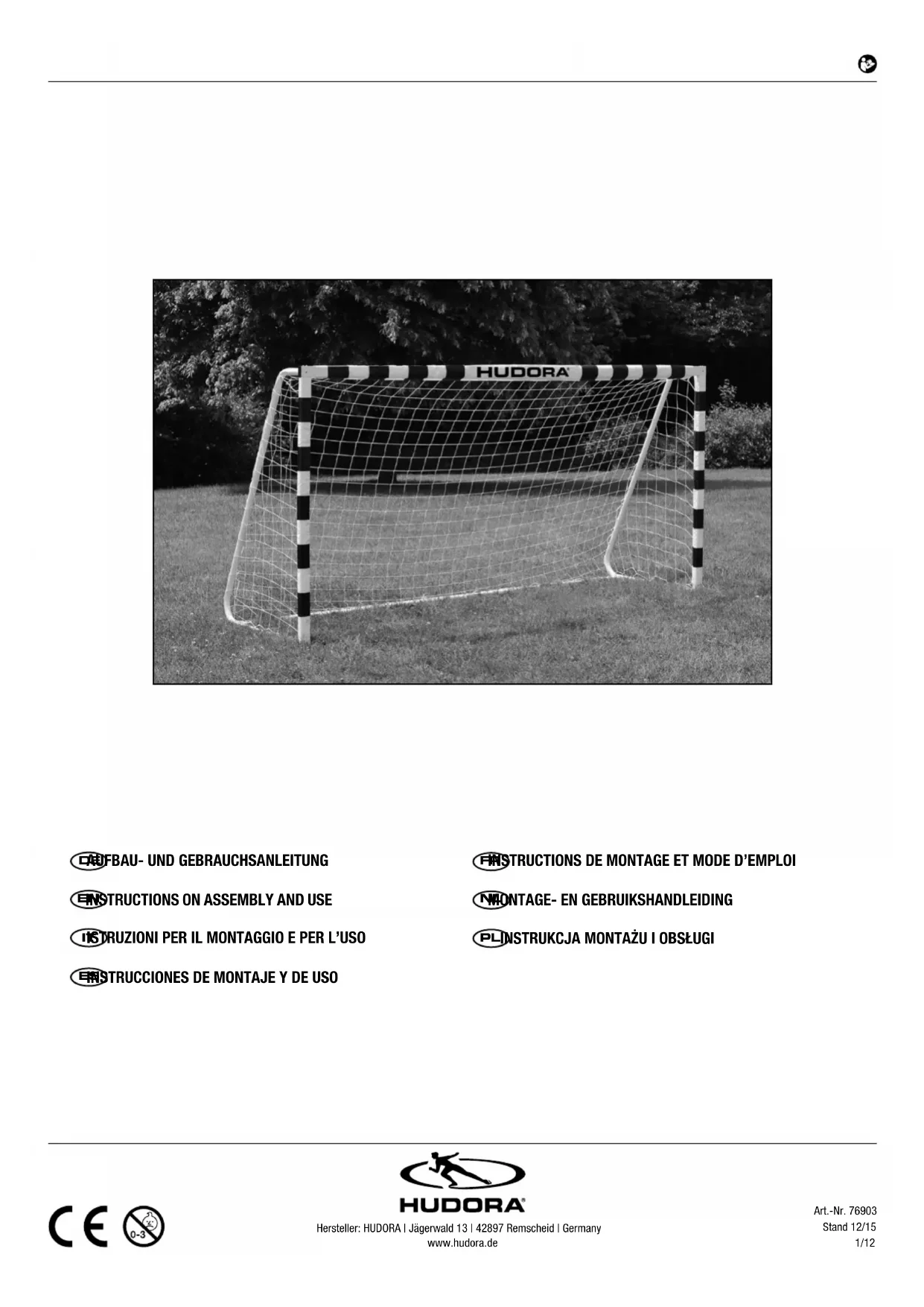 Article: But de football Stadion Référence de l’article: 76903 Dimensions après montage: 300 x 200 x 90 cm Si vous rencontrez certaines difficultés lors de l‘installation ou si vous souhaitez plus d‘informations sur le produit, rendez-vous sur http://www.hudora.de/ service/. PIECES CONTENUES 16 Bâtons de but 1 Filet de but 7 Sardines (pour la fixation de stabilisation) 4 Vis A avec 4 rondelles 6 Vis B avec 6 rondelles 2 Vis C avec 2 rondelles 4 Vis D avec 8 rondelles et 4 écrous 2 Cordes de fixation 1 Mode d’emploi Les autres pièces fournies ne servent qu’à assurer la protection pendant les opé- rations de transport seront donc inutiles pendant le montage et l’utilisation de l’article.
