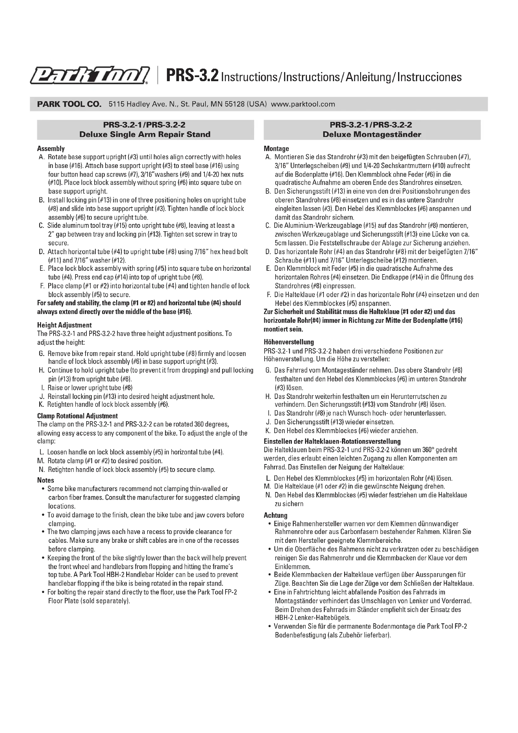 - Verwenden Sie für die permanente Bodenmontage die Park Tool FP-2 Bodenbefestigung (als Zubehör lieferbar). PRS-3.2 Instructions / Instructions / Anleitung / InstruccionesPRS-3.2-1 / PRS-3.2-2 Pied de Réparation Professionnel Deluxe Montage A. Fixer le montant bas (#3) à la base en acier (#16) à l’aide de quatre vis à têtes plates (#7), de rondels 3/16’’ (#9) et d’écrous 1/4-20 (#10). Placer le bloc d’assemblage sans le ressort (#6) dans son logement sur le montant bas. B. Insérer la goupille de verrouillage (#13) dans un des trois trous sur le montant supérieur (#8) et glisser celui-ci dans le montant bas (#3). Serrer la poignée du bloc d’assemblage (#6) afin de sécuriser le montant. C. Placer le plateau en aluminium (#15) sur le montant haut (#8), en laissant au moins 2’’ d’espace entre le plateau et la goupille de verrouillage (#13). Serrer la vis du plateau. D. Fixer le tube horizontal (#4) au montant haut (#8) à l’aide de la vis 7/16 (#11) et de la rondelle 7/16 (#12). E. Placer le bloque d’assemblage avec le ressort (#5) dans son logement (#4). Placer le capot de finition (#14) dans le haut du montant (#8). F. Placer la pince (#1 ou #2) dans le tube horizontal (#4) et serrer la poignée du bloque d’assemblage (#5) afin de bloquer la pince. Pour garantir la stabilité et la sécurité, la pince (#1 ou #2) ainsi que le tube horizontal (#4) devraient toujours être dirigés de façon à se trouver directement au-dessus du centre de la base (#16). Ajustement de la Hauteur Le PRS-3.2-1 et PRS-3.2-2 ont trois positions d’ajustement de hauteur. Pour ajuster la hauteur: G. Retirer le vélo du pied. Maintenir le montant haut (#8) fermement et desserrer la poignée du bloque d’assemblage (#6) dans le montant bas (#3). H. Continuer à maintenir le montant haut (afin qu’il ne tombe pas) et retirer la goupille de verrouillage (#13) du montant (#8).