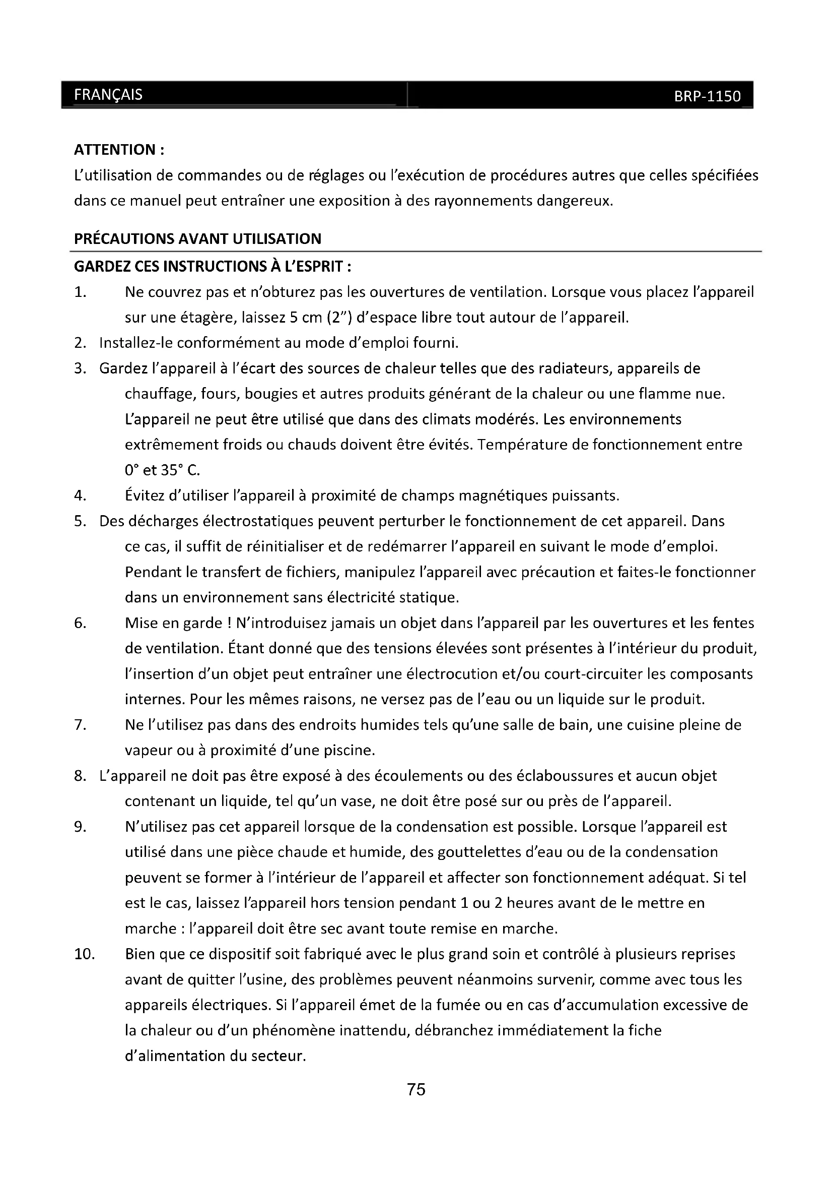 ATTENTION: L’utilisationdecommandesouderéglagesoul’exécutiondeprocéduresautresquecellesspécifiées danscemanuelpeutentraîneruneexpositionàdesrayonnementsdangereux. PRÉCAUTIONSAVANTUTILISATION GARDEZCESINSTRUCTIONSÀL’ESPRIT: