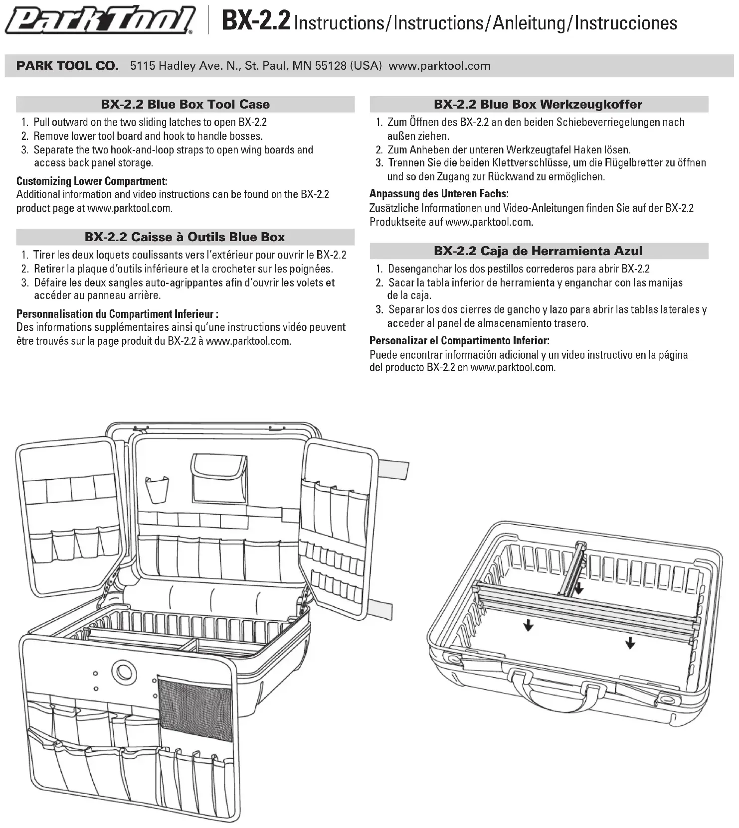 accéder au panneau arrière. Personnalisation du Compartiment Inferieur : Des informations supplémentaires ainsi qu’une instructions vidéo peuvent être trouvés sur la page produit du BX-2.2 à www.parktool.com. BX-2.2 Blue Box Werkzeugkoffer