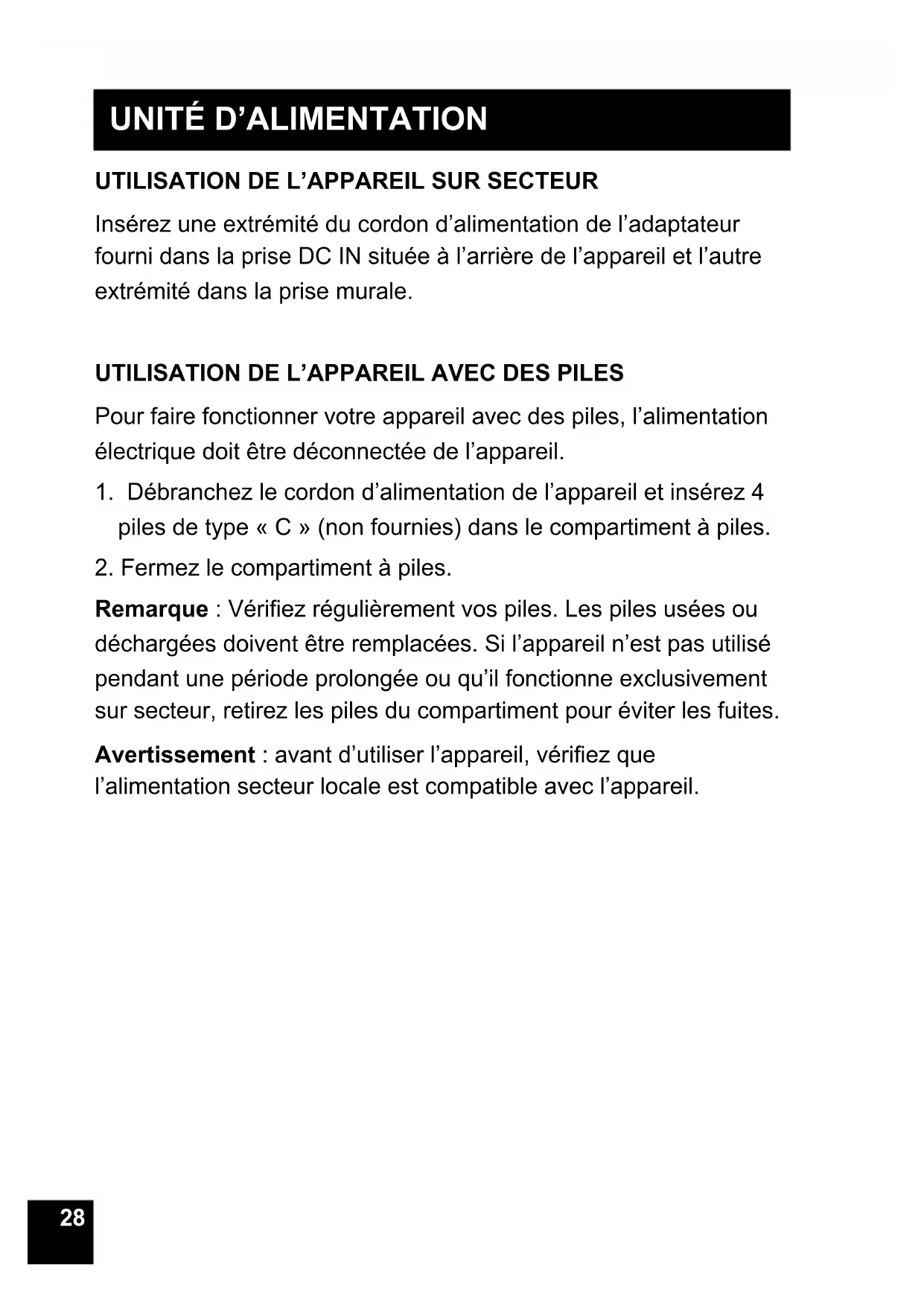 Insérezuneextrémitéducordond’alimentationdel’adaptateur fournidanslapriseDCINsituéeàl’arrièredel’appareiletl’autre extrémité dans la prise murale. UTILISATION DE L’APPAREIL AVEC DES PILES Pourfairefonctionnervotreappareilavecdespiles,l’alimentation électriquedoitêtredéconnectéedel’appareil. 1.Débranchezlecordond’alimentationdel’appareiletinsérez4 piles de type « C » (non fournies) dans le compartiment à piles.